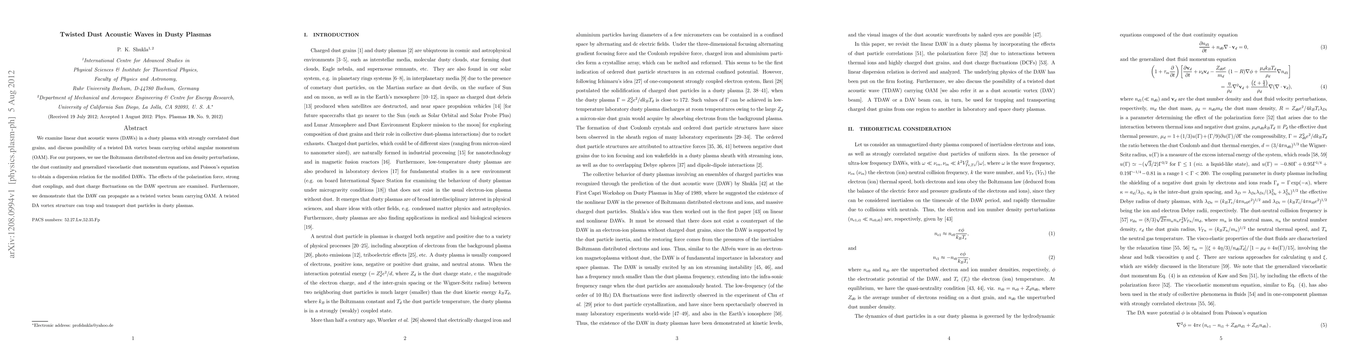 This paper investigates linear dust acoustic waves in strongly correlated dusty plasmas, focusing on the potential for these waves to form twisted vortex beams with orbital angular momentum. The study employs Boltzmann distributions and viscoelastic dust equations to derive a dispersion relation, highlighting the influence of polarization forces and dust interactions on the wave spectrum.