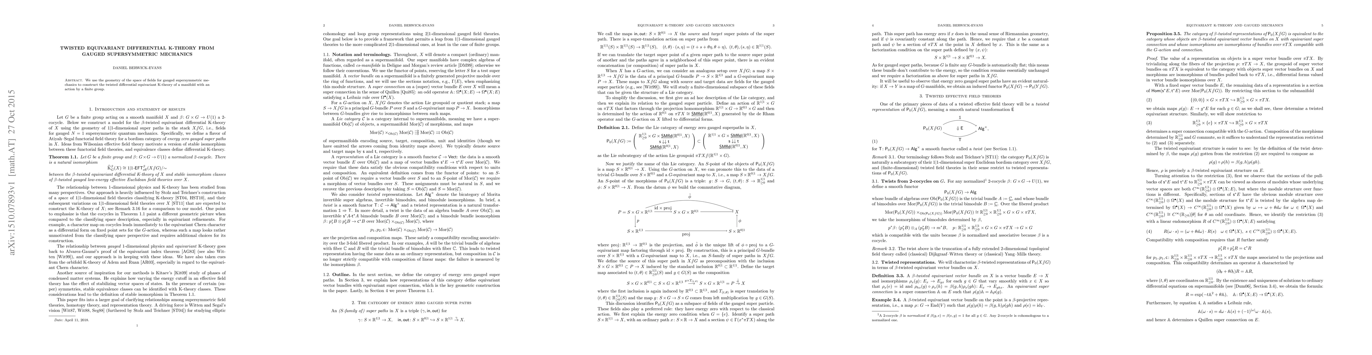Summary: The paper constructs twisted differential equivariant K-theory for a manifold with finite group action using the geometry of the field space in gauged supersymmetric mechanics. This approach links geometric and supersymmetric principles in theoretical physics.