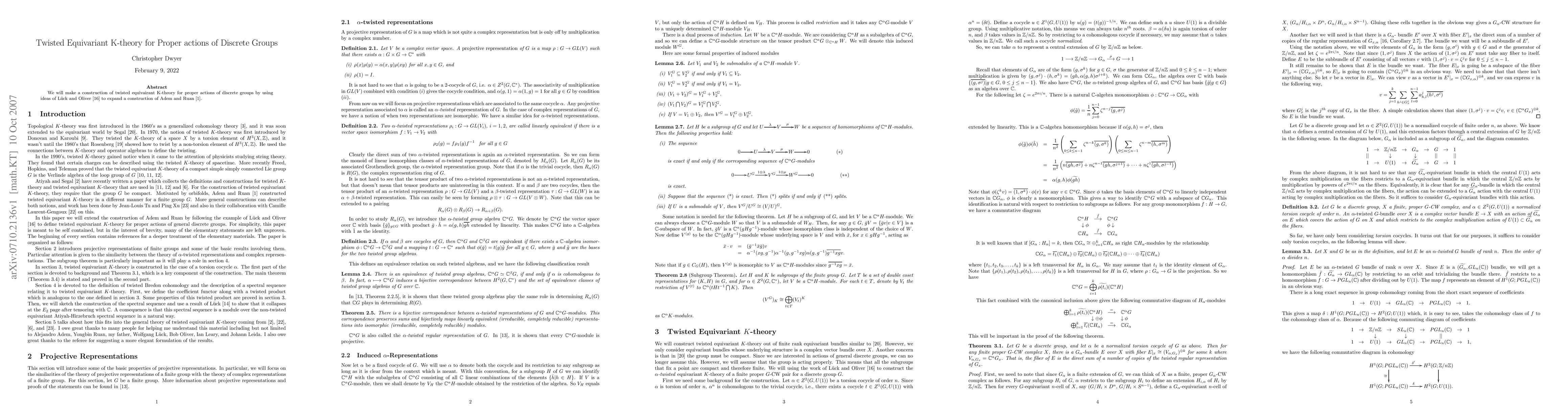 This paper constructs twisted equivariant K-theory for discrete groups acting properly, employing twisted bundles and extending existing methods. It also establishes a Chern character to twisted Bredon cohomology, partially answering when such constructions are feasible using finite rank twisted bundles.