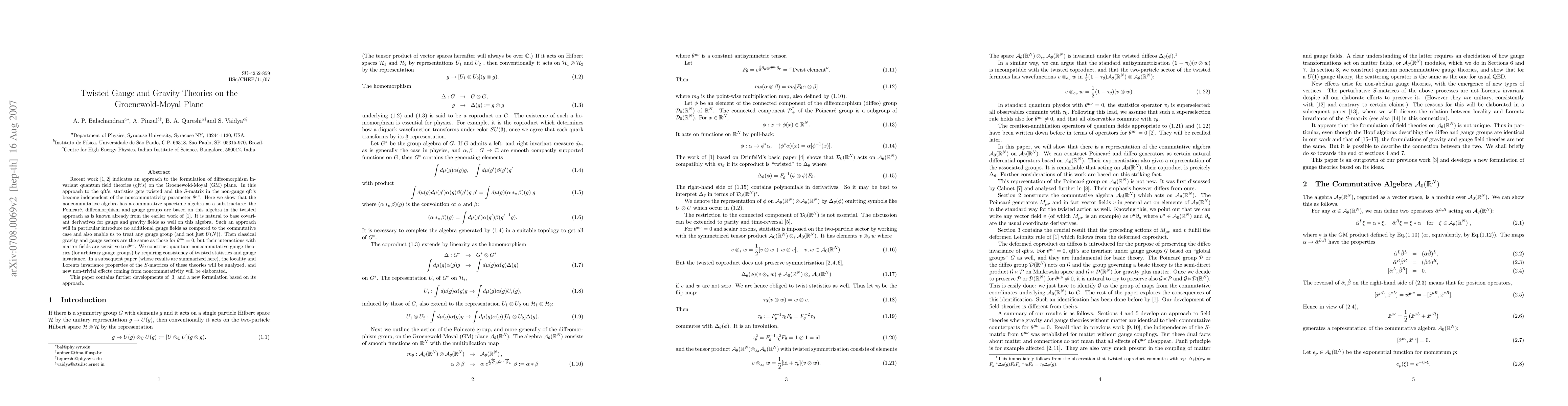 Recent work [hep-th/0504183,hep-th/0508002] indicates an approach to the formulation of diffeomorphism invariant quantum field theories (qft's) on the Groenewold-Moyal (GM) plane. In this approach to the qft's, statistics gets twisted and the S-matrix in the non-gauge qft's becomes independent of the noncommutativity parameter theta^{\mu\nu}. Here we show that the noncommutative algebra has a commutative spacetime algebra as a substructure: the Poincare, diffeomorphism and gauge groups are based on this algebra in the twisted approach as is known already from the earlier work of [hep-th/0510059]. It is natural to base covariant derivatives for gauge and gravity fields as well on this algebra. Such an approach will in particular introduce no additional gauge fields as compared to the commutative case and also enable us to treat any gauge group (and not just U(N)). Then classical gravity and gauge sectors are the same as those for \theta^{\mu \nu}=0, but their interactions with matter fields are sensitive to theta^{\mu \nu}. We construct quantum noncommutative gauge theories (for arbitrary gauge groups) by requiring consistency of twisted statistics and gauge invariance. In a subsequent paper (whose results are summarized here), the locality and Lorentz invariance properties of the S-matrices of these theories will be analyzed, and new non-trivial effects coming from noncommutativity will be elaborated. This paper contains further developments of [hep-th/0608138] and a new formulation based on its approach.