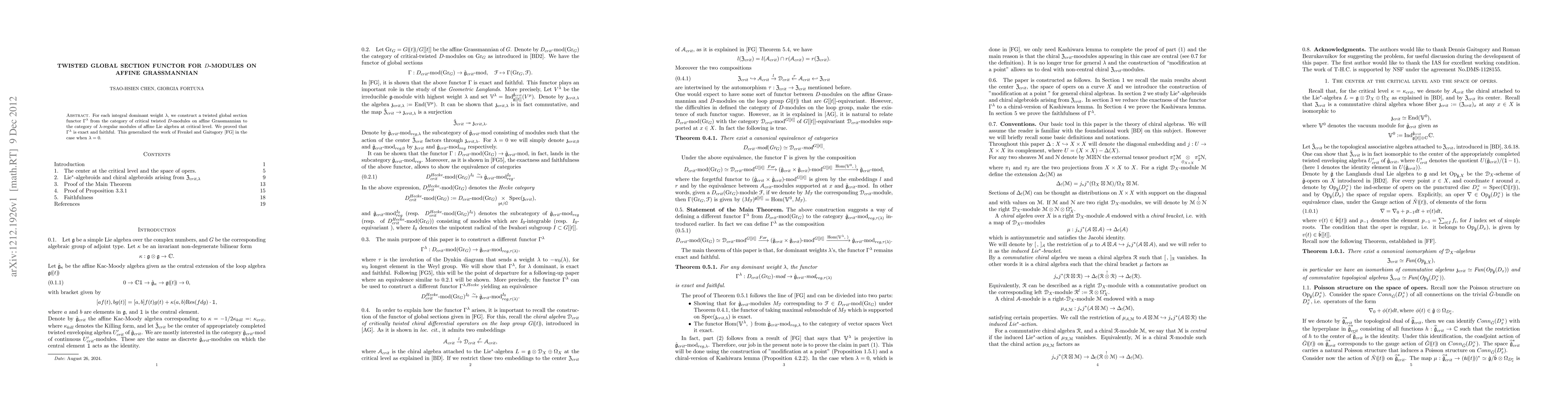 For each integral dominant weight $\lambda$, we construct a twisted global section functor $\Gamma^{\lambda}$ from the category of critical twisted $D$-modules on affine Grassmannian to the category of $\lambda$-regular modules of affine Lie algebra at critical level. We proved that $\Gamma^{\lambda}$ is exact and faithful. This generalized the work of Frenkel and Gaitsgory in the case when $\lambda=0$.