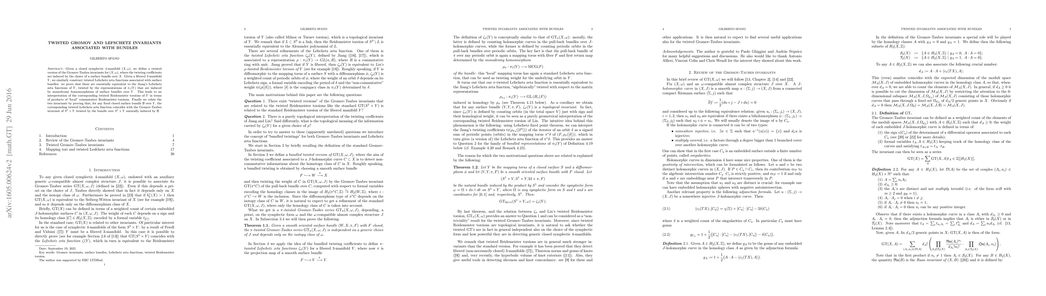Given a closed symplectic 4-manifold $(X,\omega)$, we define a twisted version of the Gromov-Taubes invariants for $(X,\omega)$, where the twisting coefficients are induced by the choice of a surface bundle over $X$. Given a fibered 3-manifold $Y$, we similarly construct twisted Lefschetz zeta functions associated with surface bundles: we prove that these are essentially equivalent to the Jiang's Lefschetz zeta functions of $Y$, twisted by the representations of $\pi_1(Y)$ that are induced by monodromy homomorphisms of surface bundles over $Y$. This leads to an interpretation of the corresponding twisted Reidemeister torsions of $Y$ in terms of products of "local" commutative Reidemeister torsions. Finally we relate the two invariants by proving that, for any fixed closed surface bundle $\mathcal{B}$ over $Y$, the corresponding twisted Lefschetz zeta function coincides with the Gromov-Taubes invariant of $S^1 \times Y$ twisted by the bundle over $S^1 \times Y$ naturally induced by $\mathcal{B}$.