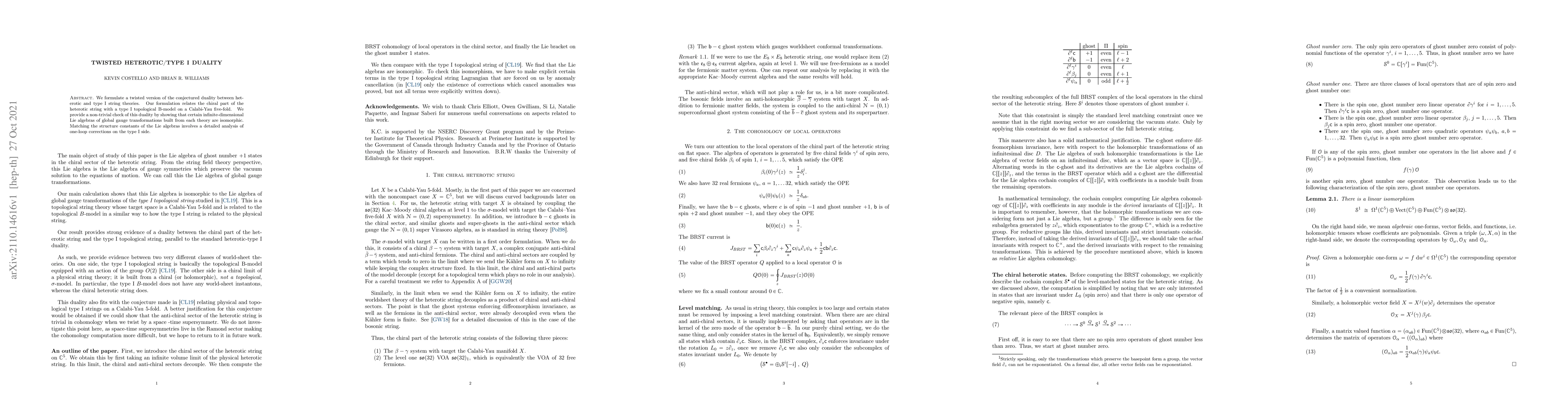 This paper formulates a twisted duality between heterotic and type I string theories, relating the heterotic string's chiral sector to a type I topological B-model on a Calabi-Yau five-fold, and verifies this duality through isomorphic infinite-dimensional Lie algebras of global gauge transformations.