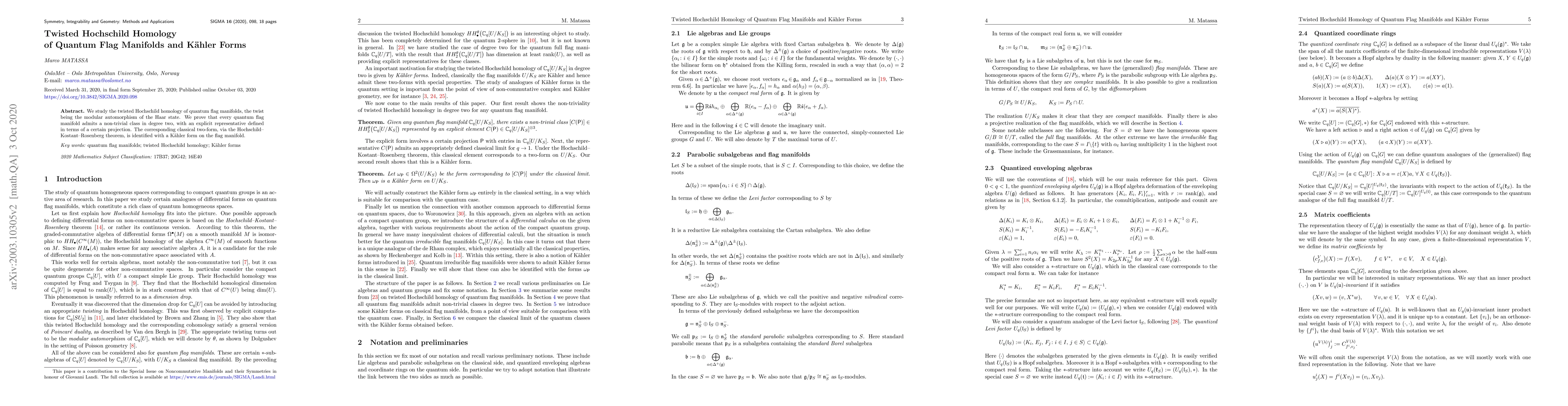We study the twisted Hochschild homology of quantum flag manifolds, the twist being the modular automorphism of the Haar state. We prove that every quantum flag manifold admits a non-trivial class in degree two, with an explicit representative defined in terms of a certain projection. The corresponding classical two-form, via the Hochschild-Kostant-Rosenberg theorem, is identified with a K\"ahler form on the flag manifold.
