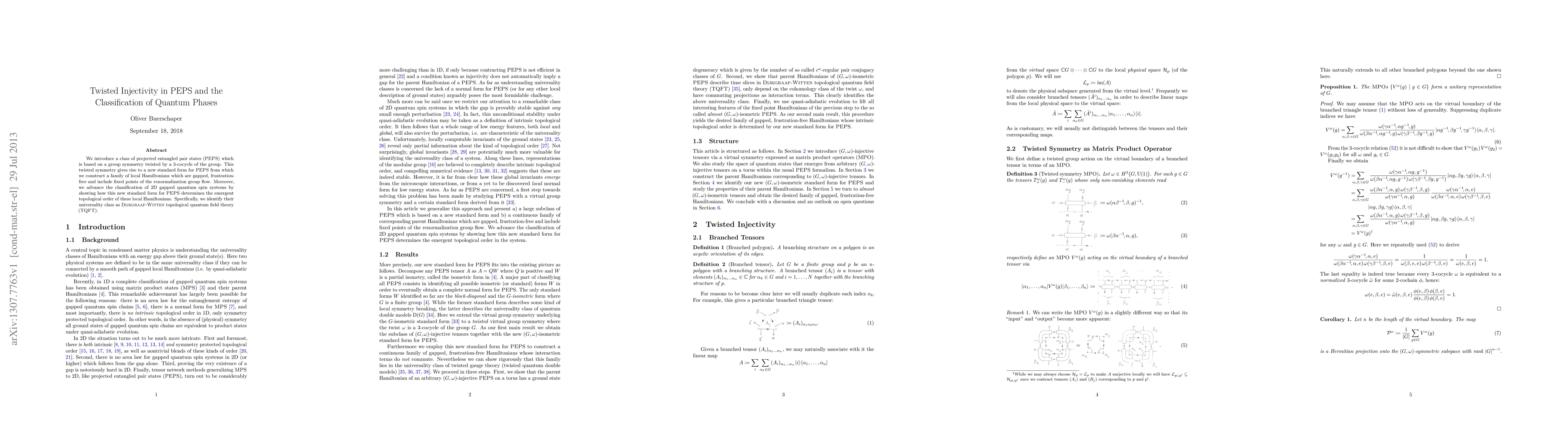 This paper introduces a novel class of PEPS based on group symmetry twisted by a 3-cocycle, leading to a new standard form that defines gapped, frustration-free local Hamiltonians. It advances the classification of 2D quantum spin systems by linking their topological order to Dijkgraaf-Witten TQFT.