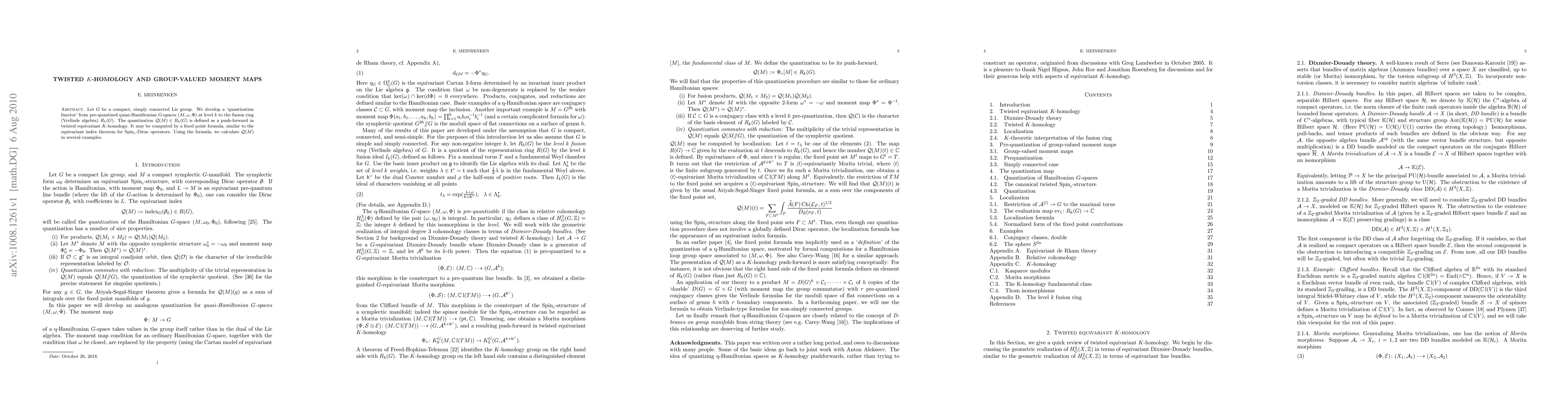 Let G be a compact, simply connected Lie group. We develop a `quantization functor' from pre-quantized quasi-Hamiltonian G-spaces at level k to the fusion ring (Verlinde algebra) R_k(G). The quantization Q(M) is defined as a push-forward in twisted equivariant K-homology. It may be computed by a fixed point formula, similar to the equivariant index theorem for Spin_c-Dirac operators. Using the formula, we calculate Q(M) in several examples.