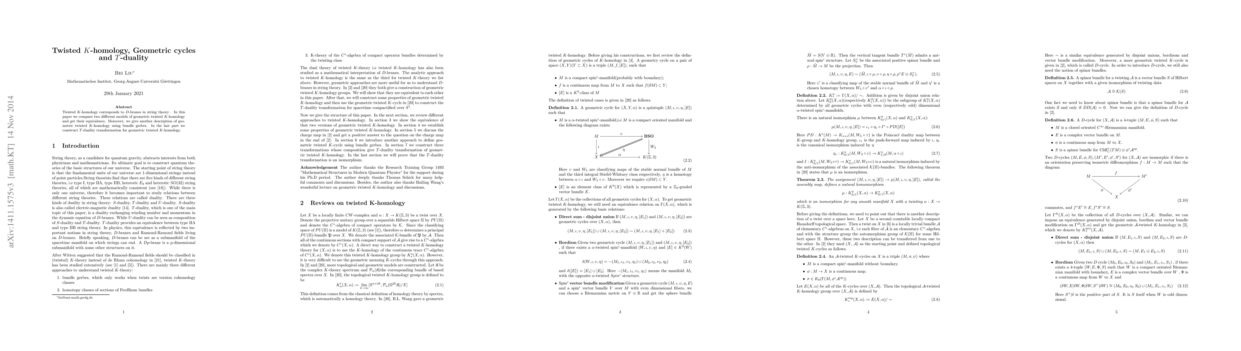 This paper examines twisted $K$-homology in string theory, comparing two models for its geometric representation and establishing their equivalence. It also introduces a new description using bundle gerbes and constructs a $T$-duality isomorphism for this framework.