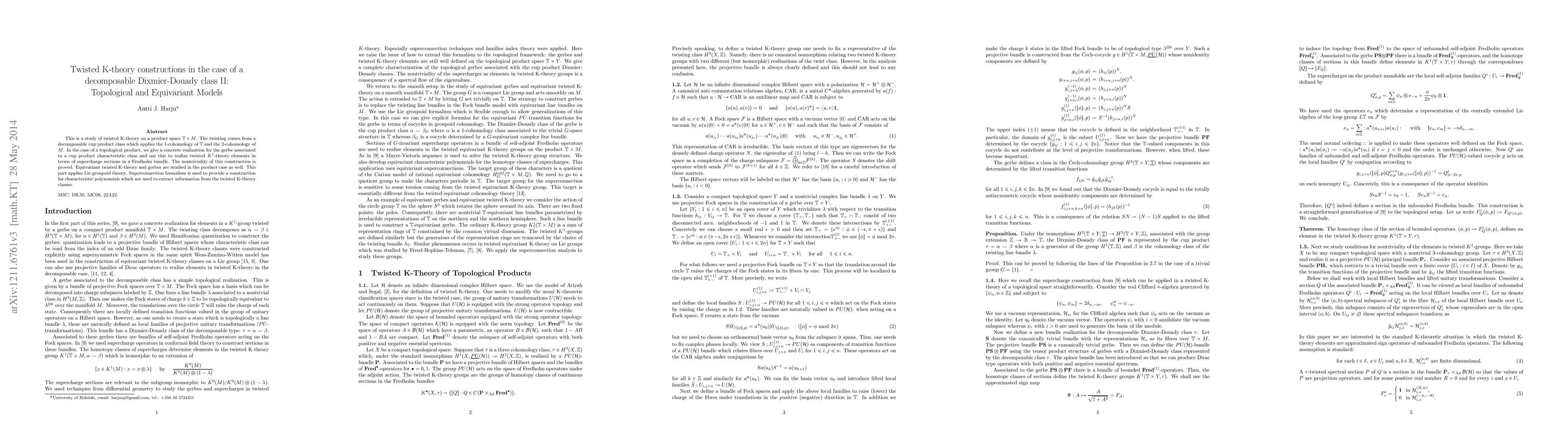This paper develops a twisted K-theory construction on product spaces using a decomposable cup product class, with applications to topological and equivariant models, including the use of supercharge sections in Fredholm bundles and characteristic polynomials.