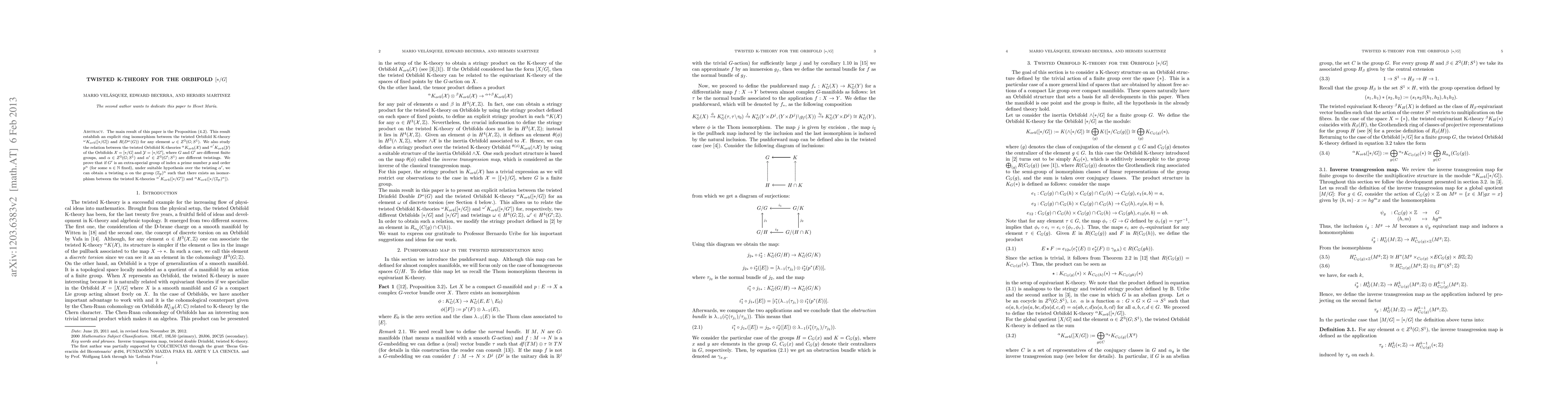 We study the relationship between the twisted Orbifold K-theories ${^{\alpha}}K_{orb}(\textsl{X})$ and ${^{\alpha'}}K_{orb}(\textsl{Y})$ for two different twists $\alpha\in Z^3(G;S^1)$ and $\alpha'\in Z^3(G';S^1)$ of the Orbifolds $\textsl{X}=[*/G]$ and $\textsl{Y}=[*/G']$ respectively, for $G$ and $G'$ finite groups. We prove that under suitable hypothesis over the twisting $\alpha'$ and the group $G'$ we obtain an isomorphism between these twisted K-theories.