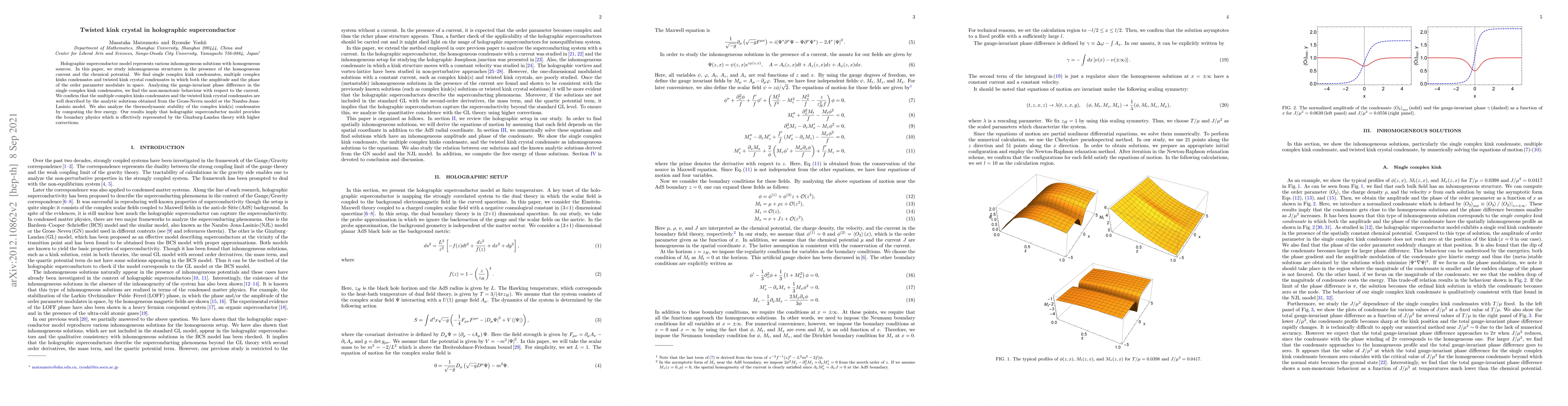 This paper investigates inhomogeneous structures in holographic superconductors under homogeneous current and chemical potential, discovering single, multiple, and twisted kink crystal condensates. The study confirms the validity of analytic solutions from the Gross-Neveu and Nambu-Jona-Lasinio models and analyzes thermodynamic stability, suggesting the holographic model's boundary physics aligns with Ginzburg-Landau theory.