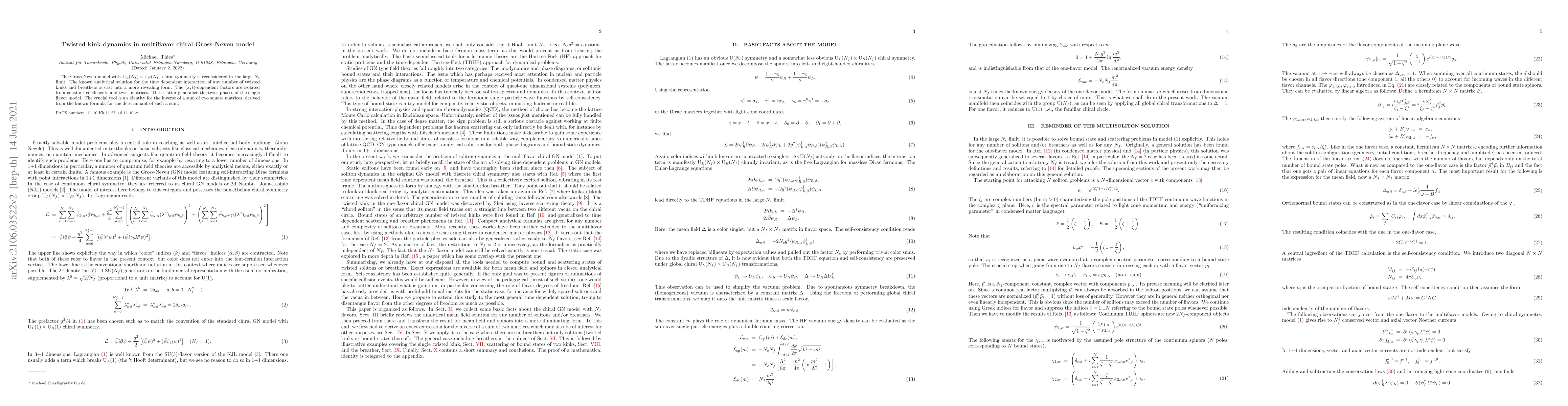 The Gross-Neveu model with ${\rm U}_L(N_f)\times{\rm U}_R(N_f)$ chiral symmetry is reconsidered in the large $N_c$ limit. The known analytical solution for the time dependent interaction of any number of twisted kinks and breathers is cast into a more revealing form. The ($x,t$)-dependent factors are isolated from constant coefficients and twist matrices. These latter generalize the twist phases of the single flavor model. The crucial tool is an identity for the inverse of a sum of two square matrices, derived from the known formula for the determinant of such a sum.
