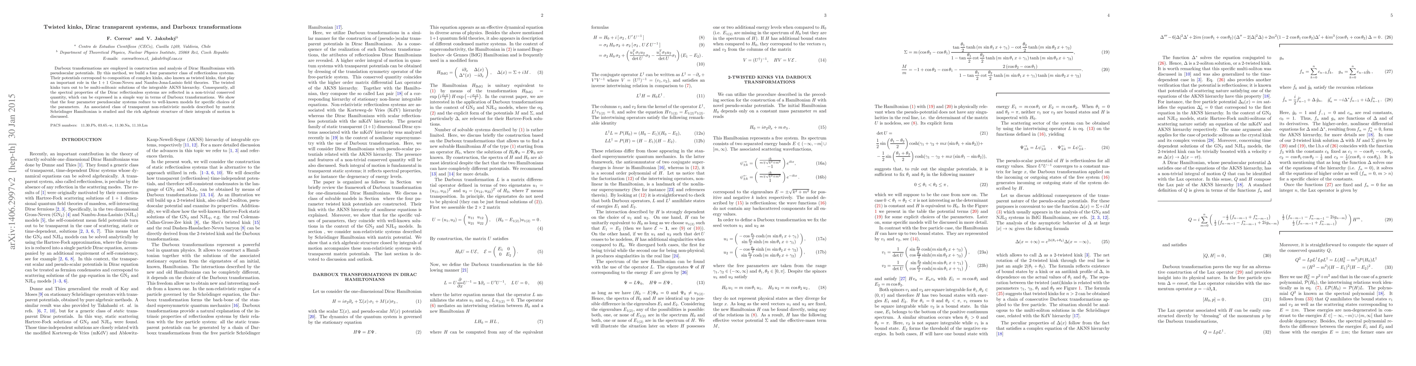 Darboux transformations are employed in construction and analysis of Dirac Hamiltonians with pseudoscalar potentials. By this method, we build a four parameter class of reflectionless systems. Their potentials correspond to composition of complex kinks, also known as twisted kinks, that play an important role in the $1+1$ Gross-Neveu and Nambu-Jona-Lasinio field theories. The twisted kinks turn out to be multi-solitonic solutions of the integrable AKNS hierarchy. Consequently, all the spectral properties of the Dirac reflectionless systems are reflected in a non-trivial conserved quantity, which can be expressed in a simple way in terms of Darboux transformations. We show that the four parameter pseudoscalar systems reduce to well-known models for specific choices of the parameters. An associated class of transparent non-relativistic models described by matrix Schr\"odinger Hamiltonian is studied and the rich algebraic structure of their integrals of motion is discussed.