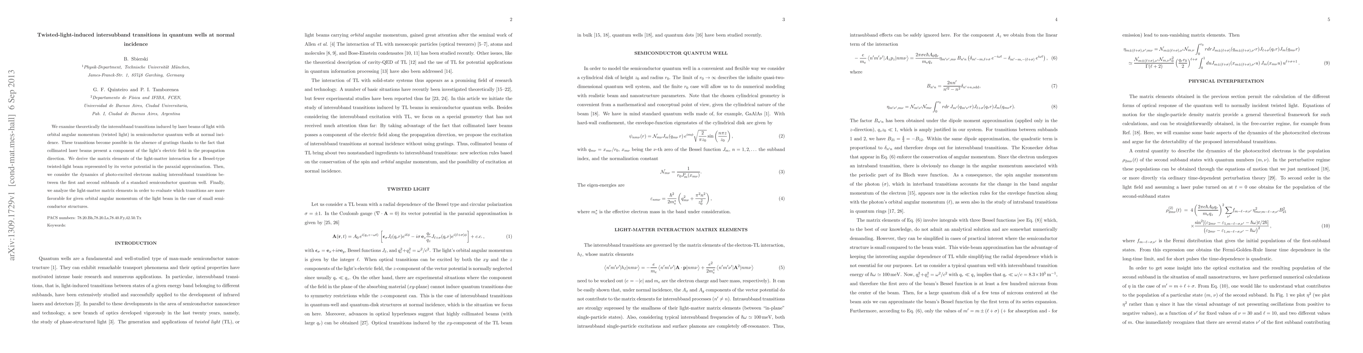 This paper theoretically investigates intersubband transitions in quantum wells induced by twisted light beams, revealing that these transitions occur without gratings due to the light's electric field component along the propagation direction. The study derives matrix elements for a Bessel-type twisted beam and analyzes the dynamics of photo-excited electrons, concluding which transitions are most favorable for small semiconductor structures.