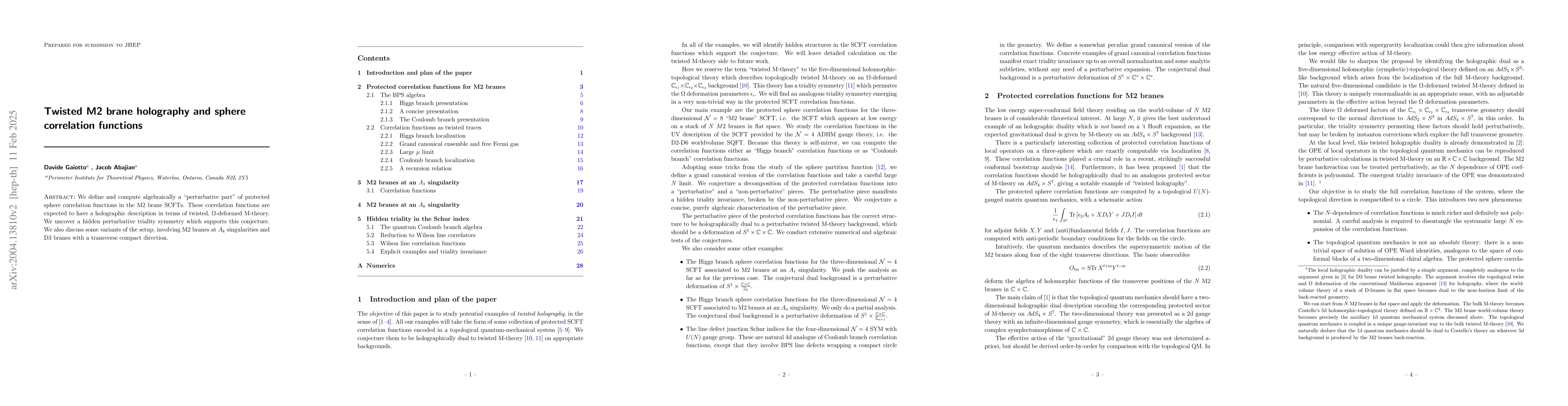 The paper defines and computes protected sphere correlation functions in M2 brane SCFTs, revealing a hidden perturbative triality symmetry that supports their holographic description via twisted, $\Omega$-deformed M-theory. It also explores variations involving M2 branes at $A_k$ singularities and D3 branes with a compact transverse direction.