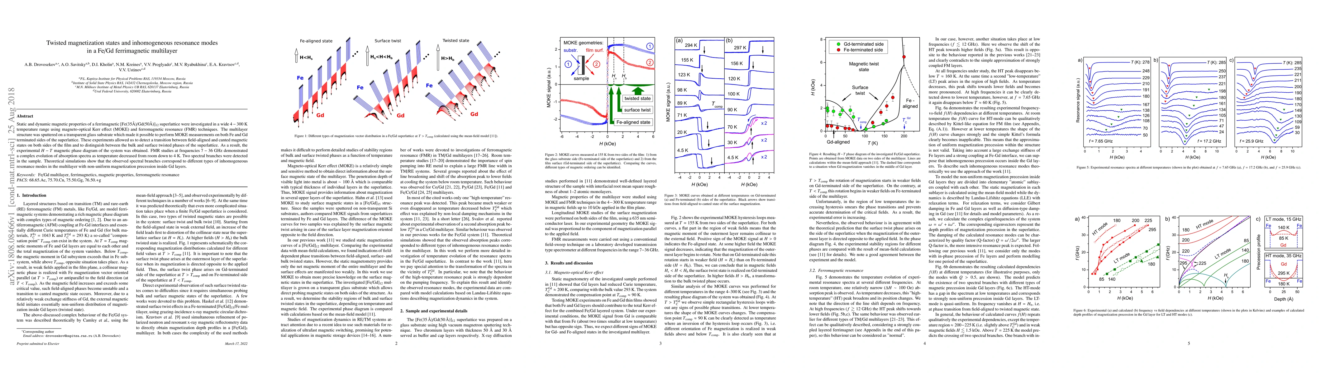 This study investigates the magnetic properties of a Fe/Gd ferrimagnetic multilayer using MOKE and FMR techniques, revealing a transition between magnetic states and identifying complex resonance modes due to non-uniform magnetization in Gd layers. The research provides a detailed magnetic phase diagram and insight into inhomogeneous resonance modes.