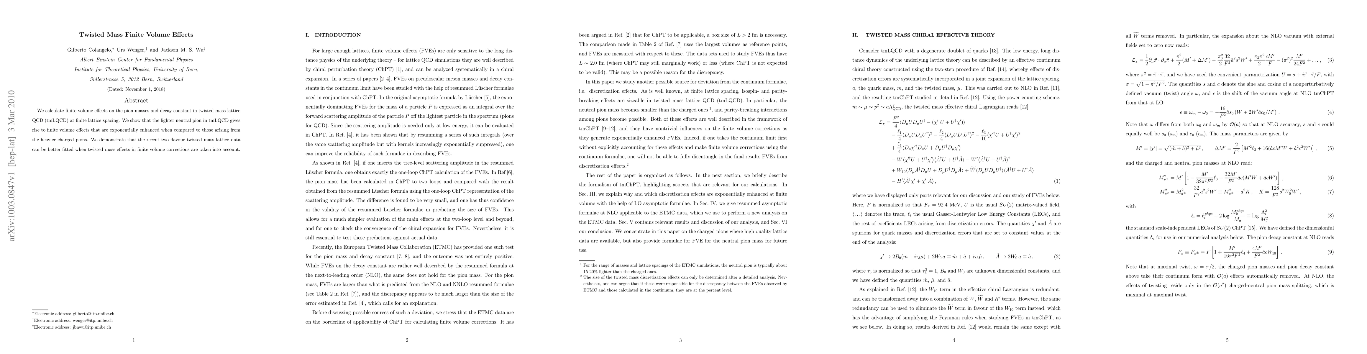 This paper investigates finite volume effects in twisted mass lattice QCD, finding that the neutral pion exhibits significantly stronger exponential effects compared to charged pions. It concludes that incorporating twisted mass corrections in finite volume improves the fit of recent two-flavor lattice data.