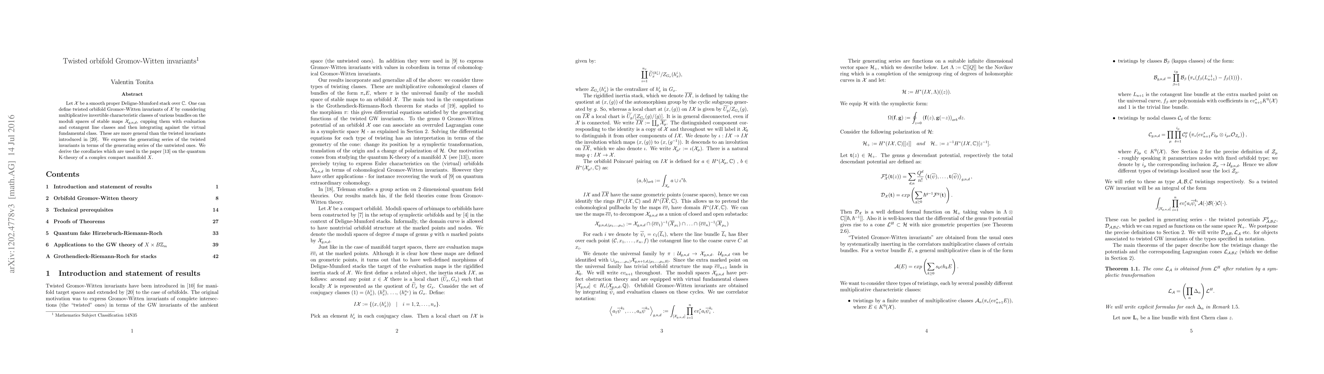Let $\ix$ be a smooth Deligne-Mumford stack over the complex numbers. One can define twisted orbifold Gromov-Witten invariants of $\ix$ by considering multiplicative invertible characteristic classes of various bundles on the moduli spaces of stable maps $\ix_{g,n,d}$, cupping them with evaluation and cotangent line classes and then integrating against the virtual fundamental class. These are more general than the twisted invariants introduced by Tseng. We express the generating series of the twisted invariants in terms of the generating series of the untwisted ones. We derive the corollaries which are used in the work of Givental-Tonita on the quantum K-theory of a complex manifold X.