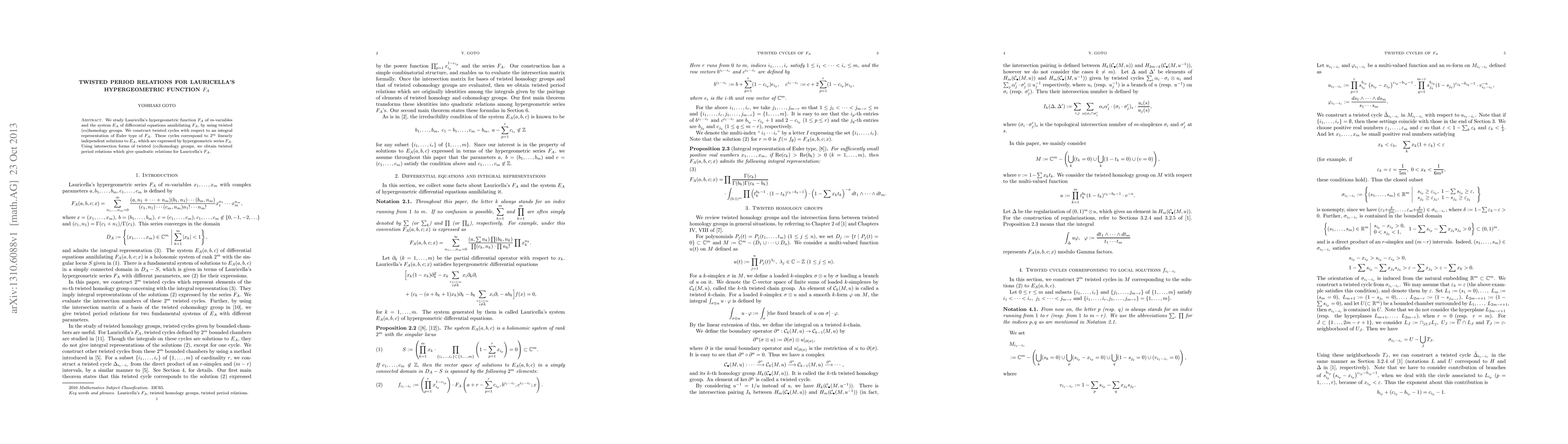 This paper investigates Lauricella's hypergeometric function $F_A$ and its associated differential equations $E_A$ using twisted (co)homology. It constructs twisted cycles corresponding to $2^m$ independent solutions expressed as $F_A$ hypergeometric series, leading to twisted period relations that yield quadratic relations for $F_A$.