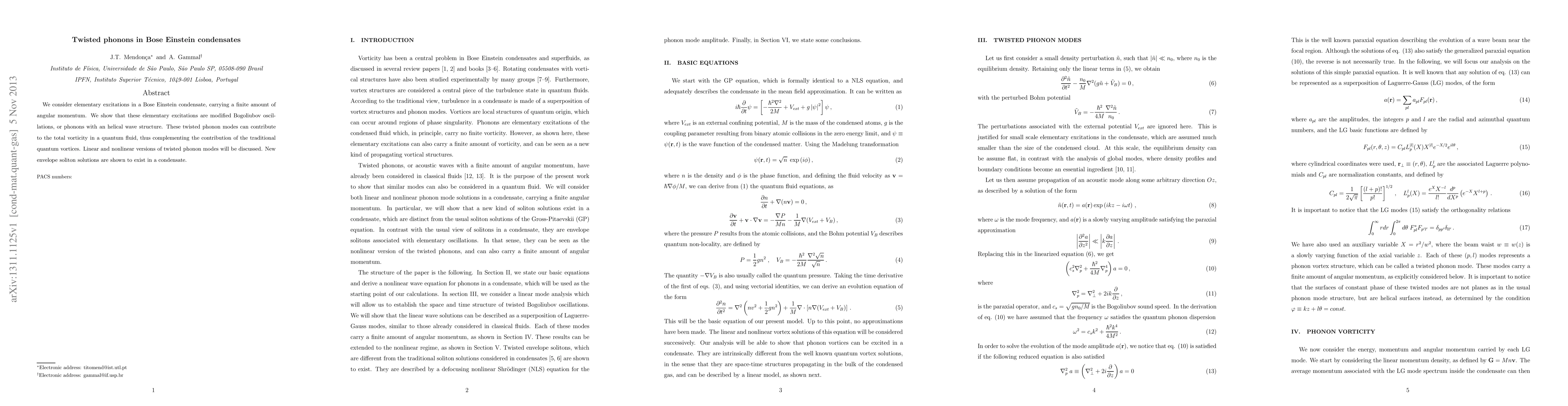 This paper explores twisted phonons in Bose-Einstein condensates, demonstrating that these phonons exhibit helical wave structures and contribute to the total vorticity in quantum fluids. It also discusses linear and nonlinear twisted phonon modes and presents new envelope soliton solutions.