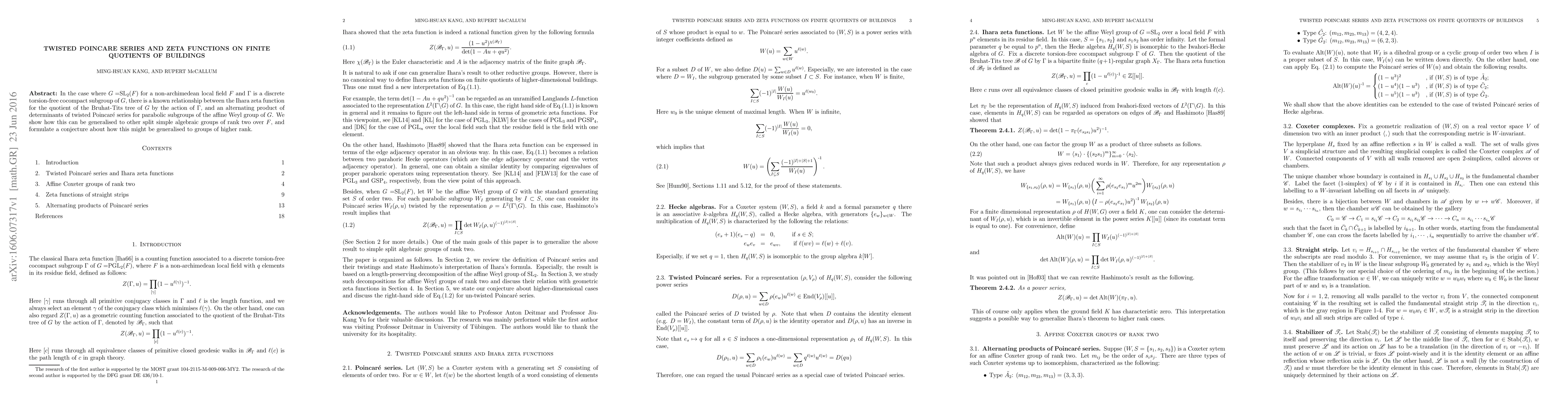 In the case where $G=$SL$_{2}(F)$ for a non-archimedean local field $F$ and $\Gamma$ is a discrete torsion-free cocompact subgroup of $G$, there is a known relationship between the Ihara zeta function for the quotient of the Bruhat-Tits tree of $G$ by the action of $\Gamma$, and an alternating product of determinants of twisted Poincar\'e series for parabolic subgroups of the affine Weyl group of $G$. We show how this can be generalised to other split simple algebraic groups of rank two over $F$, and formulate a conjecture about how this might be generalised to groups of higher rank.