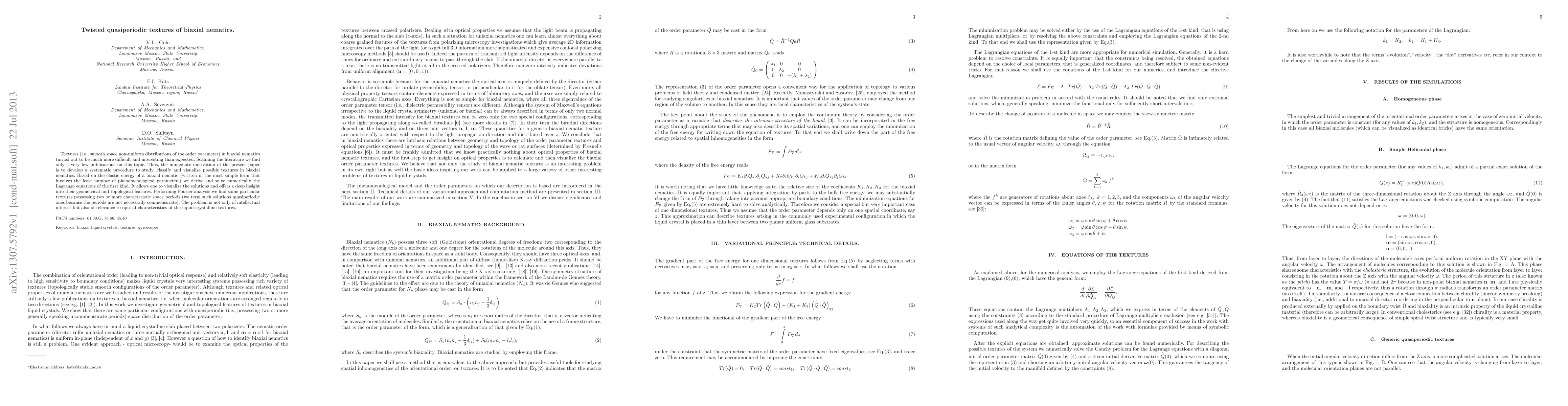 This paper develops a systematic method to study and classify biaxial nematic textures, deriving and solving Lagrange equations to visualize their geometrical and topological features. It identifies quasiperiodic textures with multiple characteristic space periods, contributing to understanding the optical characteristics of liquid-crystalline materials.