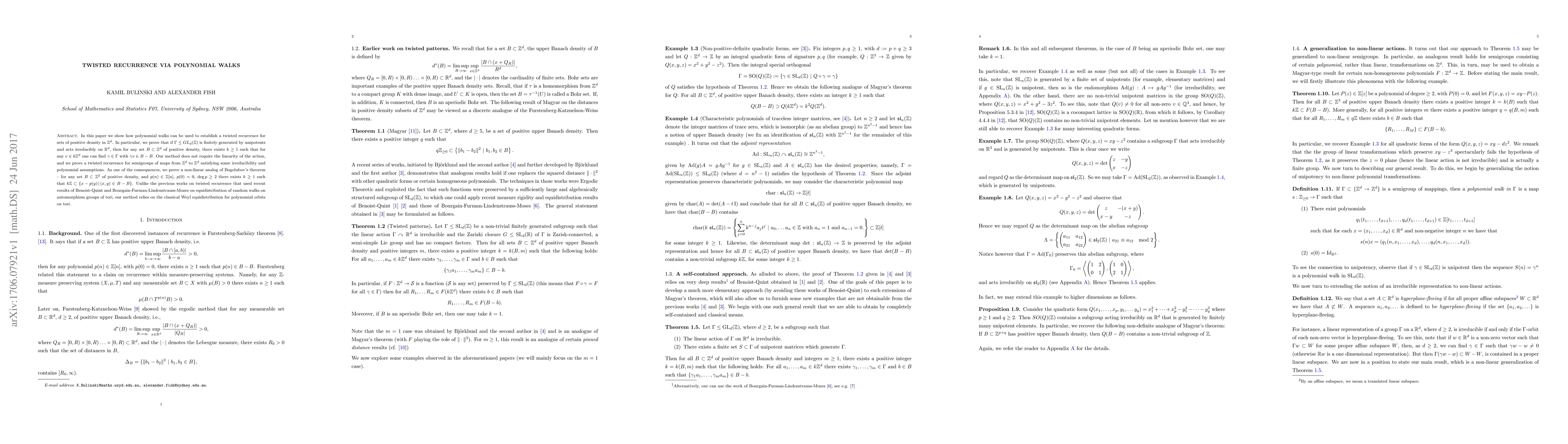 In this paper we show how polynomial walks can be used to establish a twisted recurrence for sets of positive density in $\mathbb{Z}^d$. In particular, we prove that if $\Gamma \leq \operatorname{GL}_d(\mathbb{Z})$ is finitely generated by unipotents and acts irreducibly on $\mathbb{R}^d$, then for any set $B \subset \mathbb{Z}^d$ of positive density, there exists $k \geq 1$ such that for any $v \in k \mathbb{Z}^d$ one can find $\gamma \in \Gamma$ with $\gamma v \in B - B$. Our method does not require the linearity of the action, and we prove a twisted recurrence for semigroups of maps from $\mathbb{Z}^d$ to $\mathbb{Z}^d$ satisfying some irreducibility and polynomial assumptions. As one of the consequences, we prove a non-linear analog of Bogolubov's theorem -- for any set $B \subset \mathbb{Z}^2$ of positive density, and $p(n) \in \mathbb{Z}[n]$, with $p(0) = 0$ and $\operatorname{deg}(p) \geq 2$, there exists $k \geq 1$ such that $k \mathbb{Z} \subset \{ x - p(y) \, | \, (x,y) \in B-B \}$. Unlike the previous works on twisted recurrence that used recent results of Benoist-Quint and Bourgain-Furman-Lindenstrauss-Mozes on equidistribution of random walks on automorphism groups of tori, our method relies on the classical Weyl equidistribution for polynomial orbits on tori.