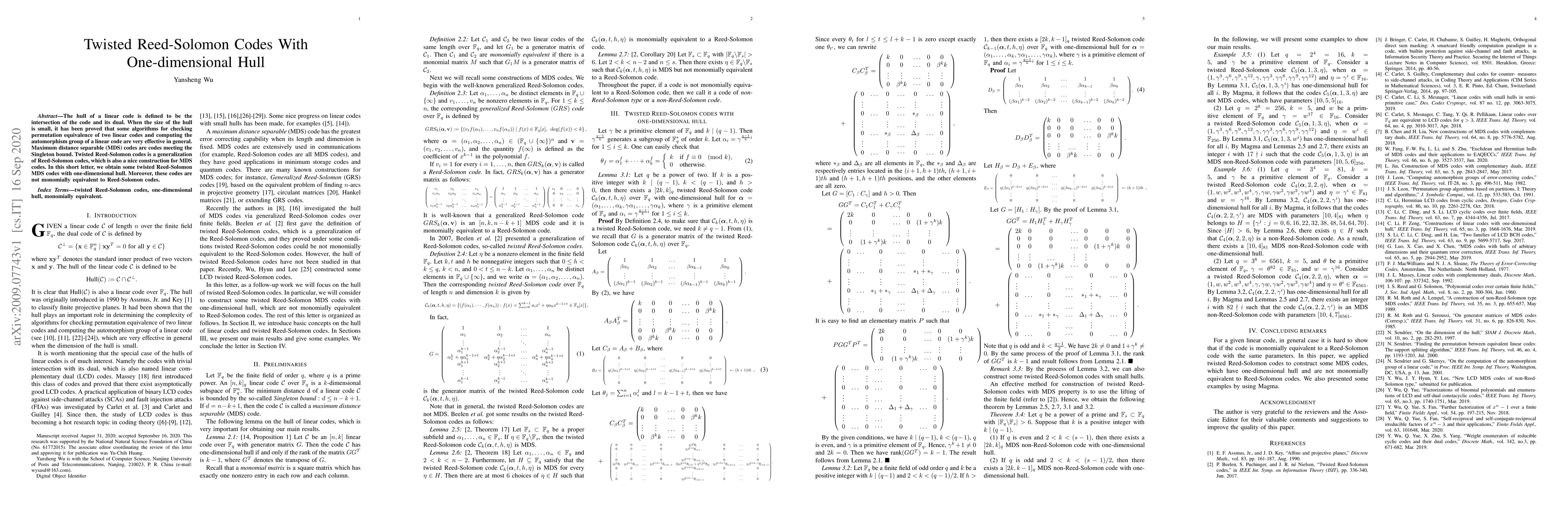 This paper investigates twisted Reed-Solomon codes, a generalization of Reed-Solomon codes, and identifies instances where these codes meet the maximum distance separable (MDS) condition with a one-dimensional hull. The codes found are not equivalent to standard Reed-Solomon codes under monomial transformations.