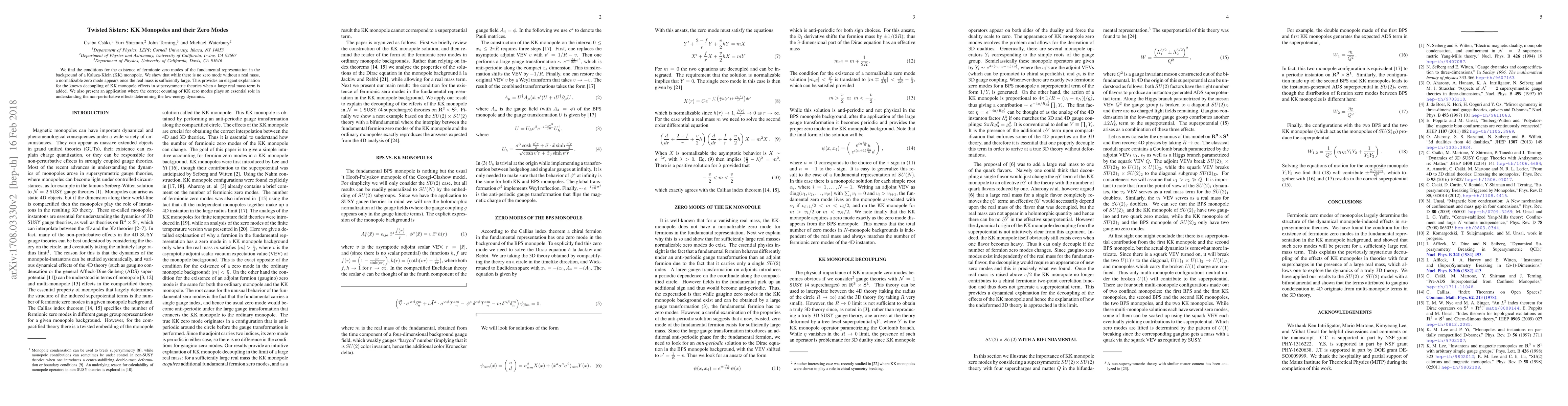 We find the conditions for the existence of fermionic zero modes of the fundamental representation in the background of a Kaluza-Klein (KK) monopole. We show that while there is no zero mode without a real mass, a normalizable zero mode appears once the real mass is sufficiently large. This provides an elegant explanation for the known decoupling of KK monopole effects in supersymmetric theories when a large real mass term is added. We also present an application where the correct counting of KK zero modes plays an essential role in understanding the non-perturbative effects determining the low-energy dynamics.