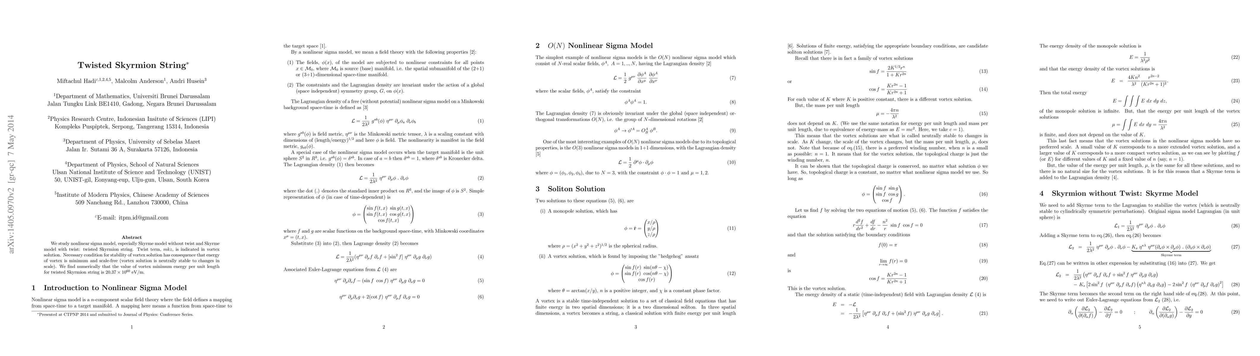 We study nonlinear sigma model, especially Skyrme model without twist and Skyrme model with twist: twisted Skyrmion string. Twist term, $mkz$, is indicated in vortex solution. Necessary condition for stability of vortex solution has consequence that energy of vortex is minimum and scale-free (vortex solution is neutrally stable to changes in scale). We find numerically that the value of vortex minimum energy per unit length for twisted Skyrmion string is $20.37\times 10^{60}~\text{eV/m}$.