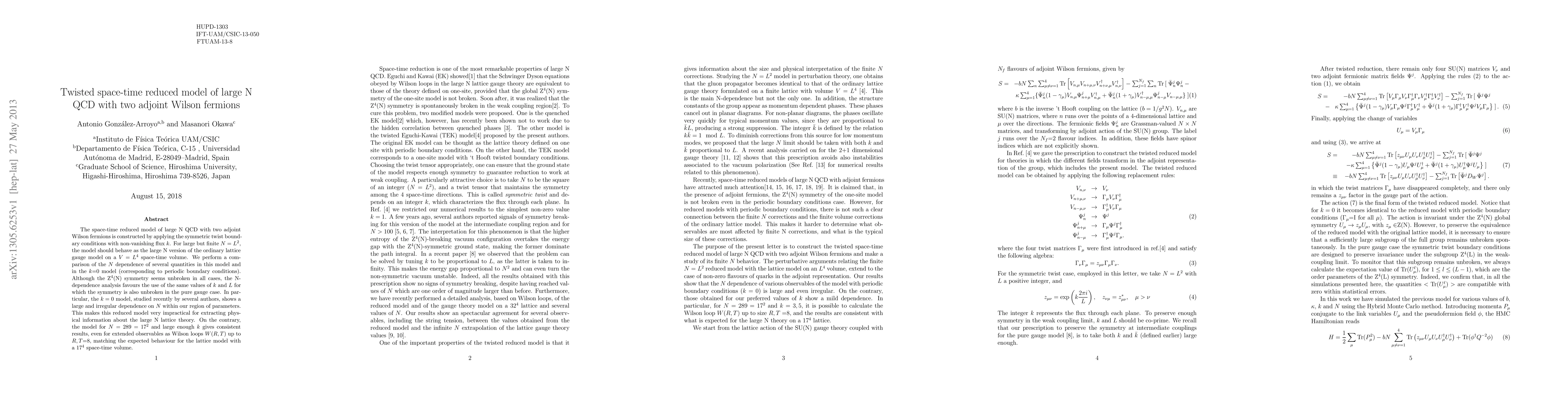 This paper constructs a space-time reduced model of large N QCD with two adjoint Wilson fermions using twisted boundary conditions. It finds that the $k=0$ model shows impractical large N dependence, while the model with $N=289$ and large $k$ provides consistent results, matching the expected lattice model behavior.