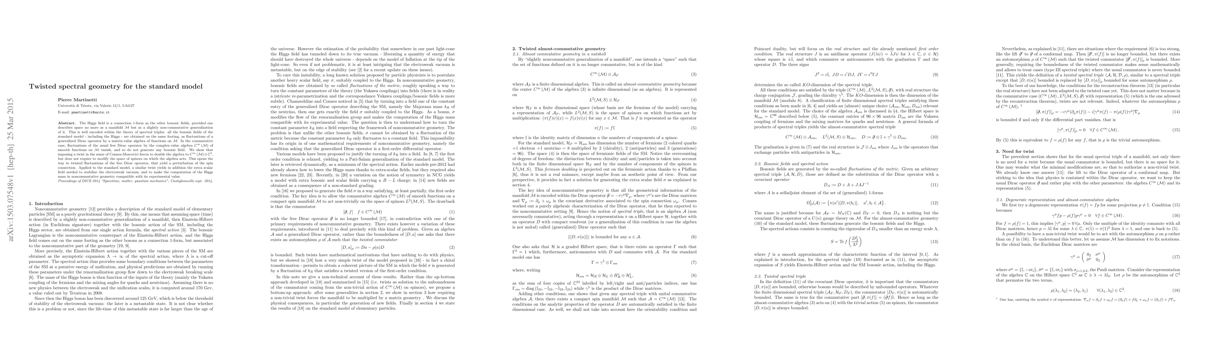 The Higgs field is a connection one-form as the other bosonic fields, provided one describes space no more as a manifold M but as a slightly non-commutative generalization of it. This is well encoded within the theory of spectral triples: all the bosonic fields of the standard model - including the Higgs - are obtained on the same footing, as fluctuations of a generalized Dirac operator by a matrix-value algebra of functions on M. In the commutative case, fluctuations of the usual free Dirac operator by the complex-value algebra A of smooth functions on M vanish, and so do not generate any bosonic field. We show that imposing a twist in the sense of Connes-Moscovici forces to double the algebra A, but does not require to modify the space of spinors on which it acts. This opens the way to twisted fluctuations of the free Dirac operator, that yield a perturbation of the spin connection. Applied to the standard model, a similar twist yields in addition the extra scalar field needed to stabilize the electroweak vacuum, and to make the computation of the Higgs mass in noncommutative geometry compatible with its experimental value.