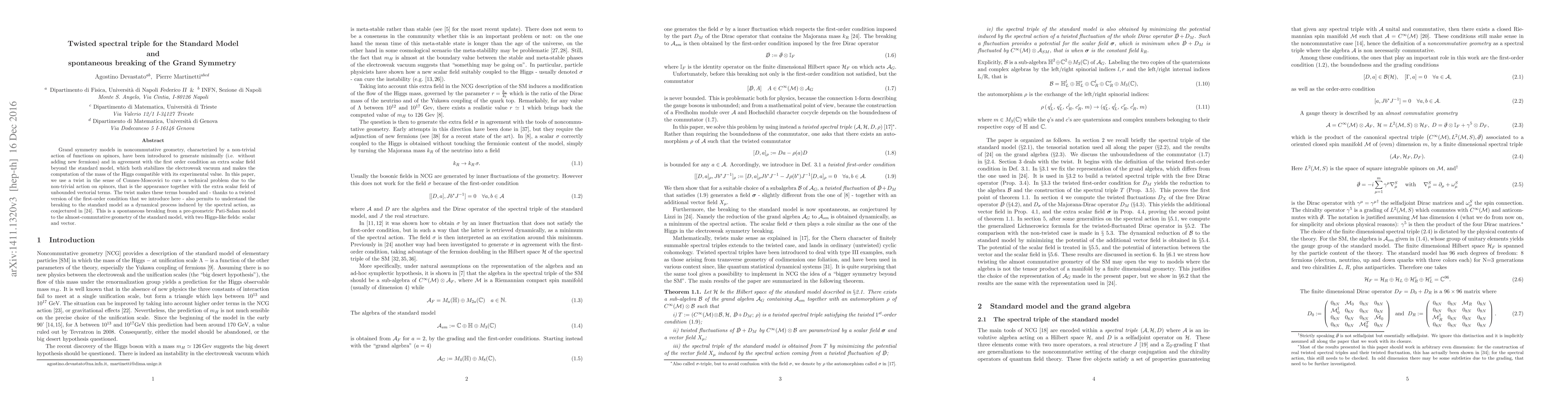 Grand symmetry models in noncommutative geometry have been introduced to explain how to generate minimally (i.e. without adding new fermions) an extra scalar field beyond the standard model, which both stabilizes the electroweak vacuum and makes the computation of the mass of the Higgs compatible with its experimental value. In this paper, we use Connes-Moscovici twisted spectral triples to cure a technical problem of the grand symmetry, that is the appearance together with the extra scalar field of unbounded vectorial terms. The twist makes these terms bounded and - thanks to a twisted version of the first-order condition that we introduce here - also permits to understand the breaking to the standard model as a dynamical process induced by the spectral action. This is a spontaneous breaking from a pre-geometric Pati-Salam model to the almost-commutative geometry of the standard model, with two Higgs-like fields: scalar and vector.