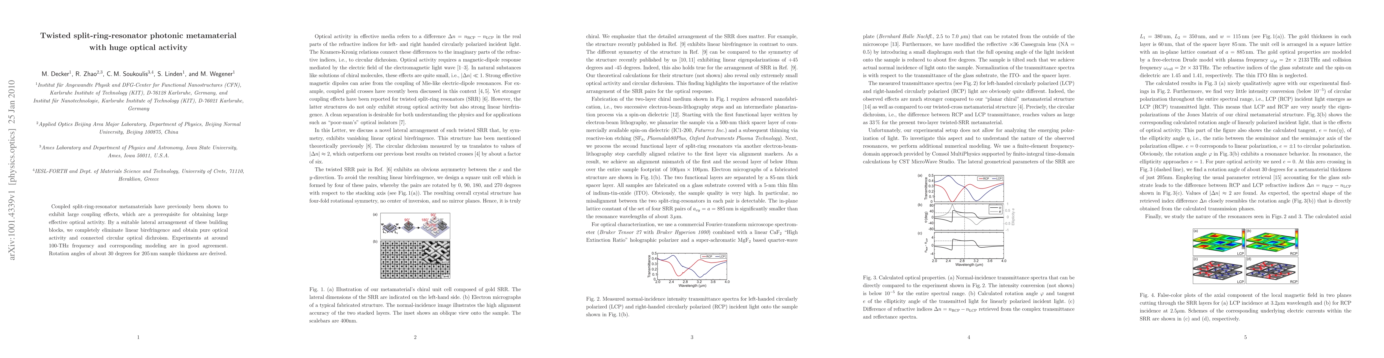 Coupled split-ring-resonator metamaterials have previously been shown to exhibit large coupling effects, which are a prerequisite for obtaining large effective optical activity. By a suitable lateral arrangement of these building blocks, we completely eliminate linear birefringence and obtain pure optical activity and connected circular optical dichroism. Experiments at around 100-THz frequency and corresponding modeling are in good agreement. Rotation angles of about 30 degrees for 205nm sample thickness are derived.