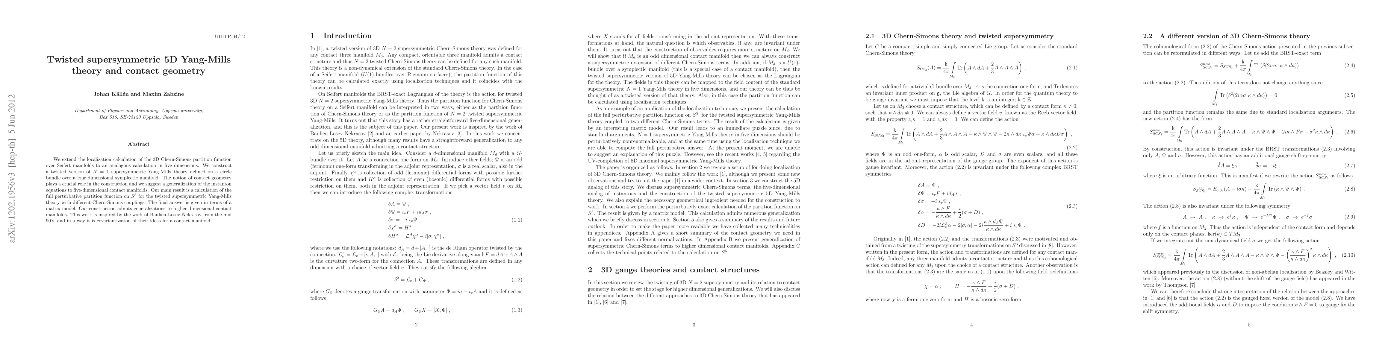 This paper extends localization calculations from 3D Chern-Simons theory to 5D, constructing a twisted supersymmetric Yang-Mills theory on a circle bundle over a symplectic manifold. The contact geometry plays a key role, and the result is a perturbative partition function on a five-sphere expressed as a matrix model, generalizable to higher dimensions.