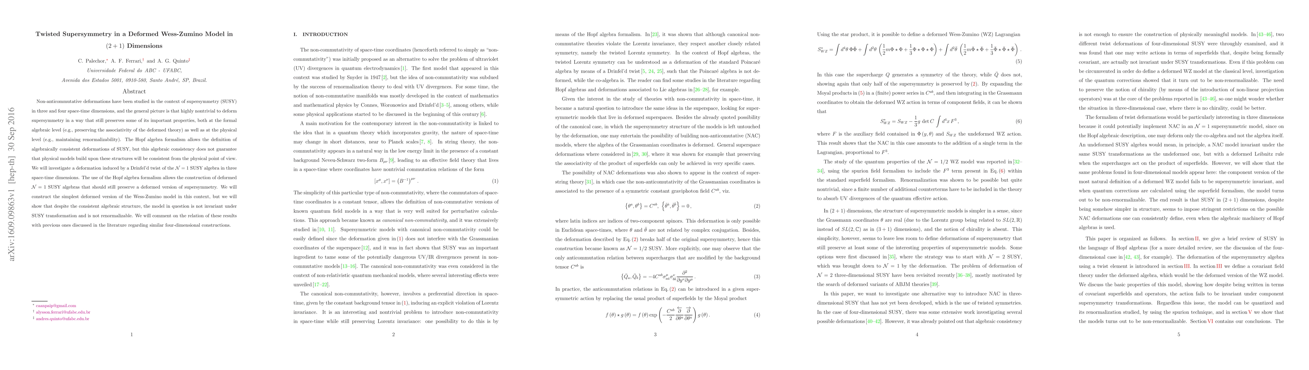 Non-anticommutative deformations have been studied in the context of supersymmetry (SUSY) in three and four space-time dimensions, and the general picture is that highly nontrivial to deform supersymmetry in a way that still preserves some of its important properties, both at the formal algebraic level (e.g., preserving the associativity of the deformed theory) as well as at the physical level (e.g., maintaining renormalizability). The Hopf algebra formalism allows the definition of algebraically consistent deformations of SUSY, but this algebraic consistency does not guarantee that physical models build upon these structures will be consistent from the physical point of view. We will investigate a deformation induced by a Drinfel'd twist of the ${\cal N}=1$ SUSY algebra in three space-time dimensions. The use of the Hopf algebra formalism allows the construction of deformed ${\cal N}=1$ SUSY algebras that should still preserve a deformed version of supersymmetry. We will construct the simplest deformed version of the Wess-Zumino model in this context, but we will show that despite the consistent algebraic structure, the model in question is not invariant under SUSY transformation and is not renormalizable. We will comment on the relation of these results with previous ones discussed in the literature regarding similar four-dimensional constructions.