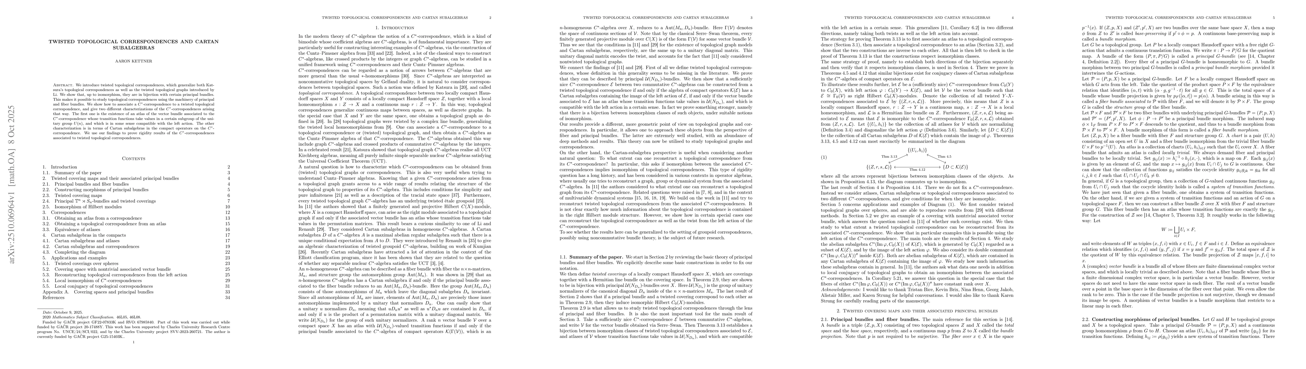 The research employs a combination of algebraic topology, noncommutative geometry, and operator algebras to analyze twisted topological correspondences and their associated Cartan subalgebras. It establishes equivalences between different mathematical structures through categorical frameworks and representation theory.