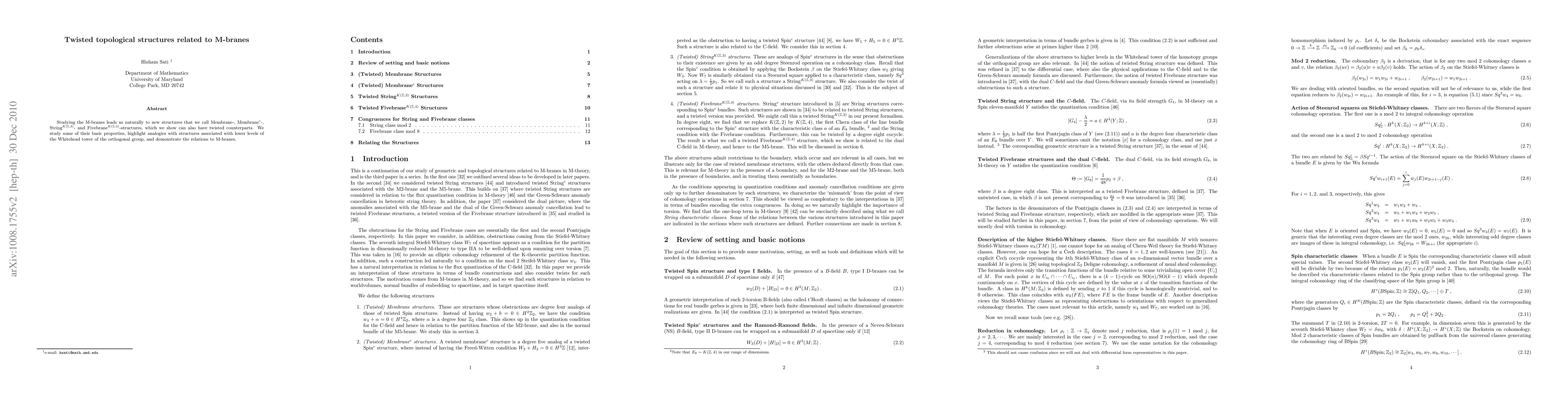Summary: This paper introduces twisted topological structures related to M-branes, including Membrane-, Membrane^c-, String^K(Z,3)-, and Fivebrane^K(Z,4)-structures, and examines their fundamental properties, their analogies to lower-level Whitehead tower structures, and their connections to M-branes.