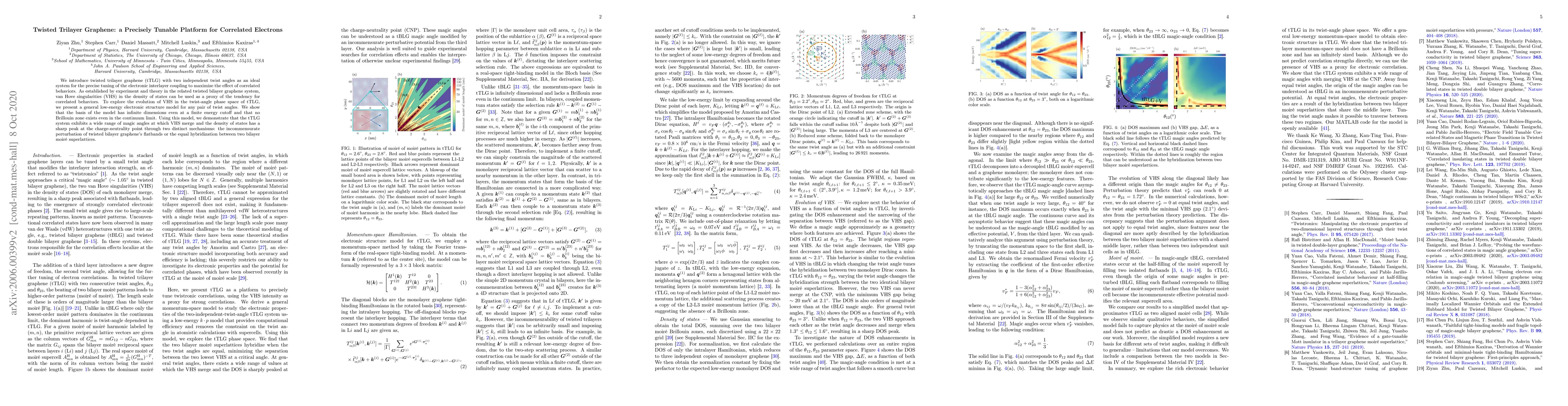We introduce twisted trilayer graphene (tTLG) with two independent twist angles as an ideal system for the precise tuning of the electronic interlayer coupling to maximize the effect of correlated behaviors. As established by experiment and theory in the related twisted bilayer graphene system, van Hove singularities (VHS) in the density of states can be used as a proxy of the tendency for correlated behaviors. To explore the evolution of VHS in the twist-angle phase space of tTLG, we present a general low-energy electronic structure model for any pair of twist angles. We show that the basis of the model has infinite dimensions even at a finite energy cutoff and that no Brillouin zone exists even in the continuum limit. Using this model, we demonstrate that the tTLG system exhibits a wide range of magic angles at which VHS merge and the density of states has a sharp peak at the charge-neutrality point through two distinct mechanisms: the incommensurate perturbation of twisted bilayer graphene's flat bands or the equal hybridization between two bilayer moir\'e superlattices.