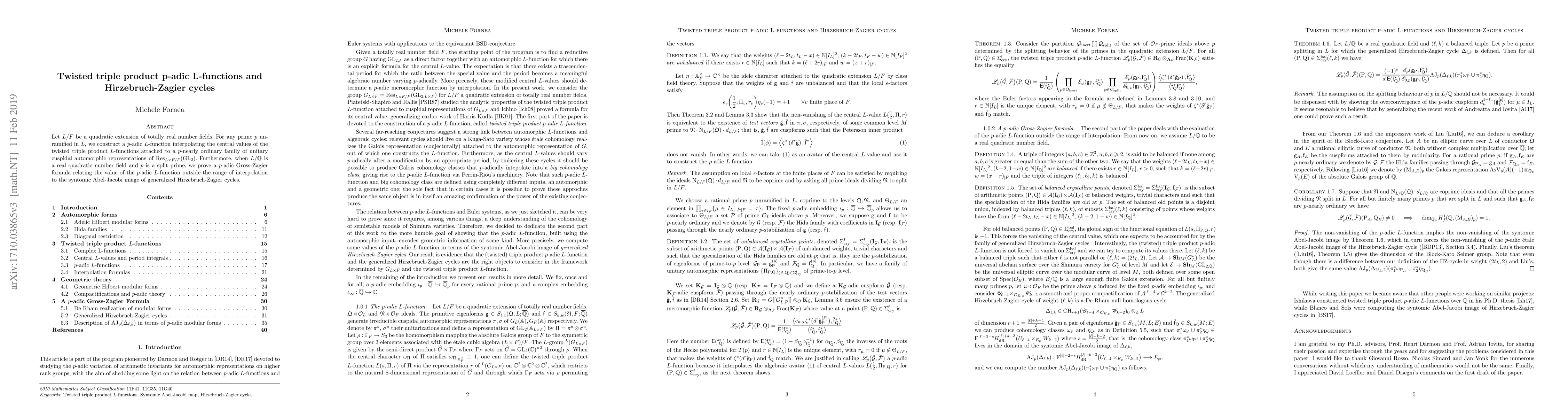 The paper constructs a $p$-adic $L$-function for a quadratic extension of totally real number fields, interpolating central values of twisted triple product $L$-functions. It also proves a $p$-adic Gross-Zagier formula linking the $p$-adic $L$-function's value outside its interpolation range to syntomic Abel-Jacobi images of generalized Hirzebruch-Zagier cycles when the extension is over $\mathbb{Q}$ and $p$ is split.