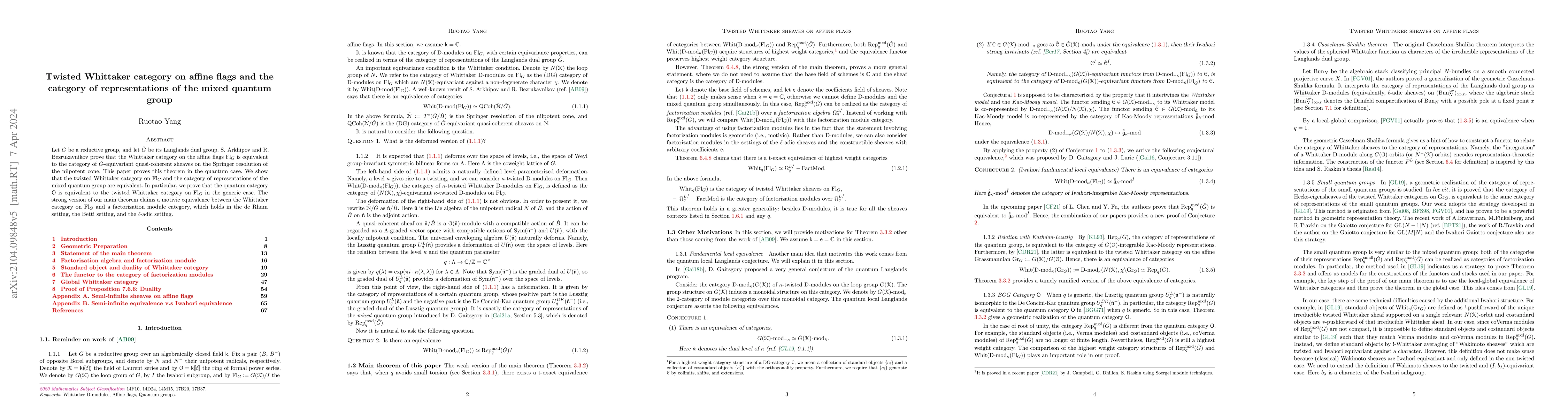 The paper proves the equivalence between the twisted Whittaker category on affine flags and the category of representations of the mixed quantum group. Specifically, it establishes that the quantum category O is equivalent to the category of twisted Whittaker D-modules on affine flags in the generic case.