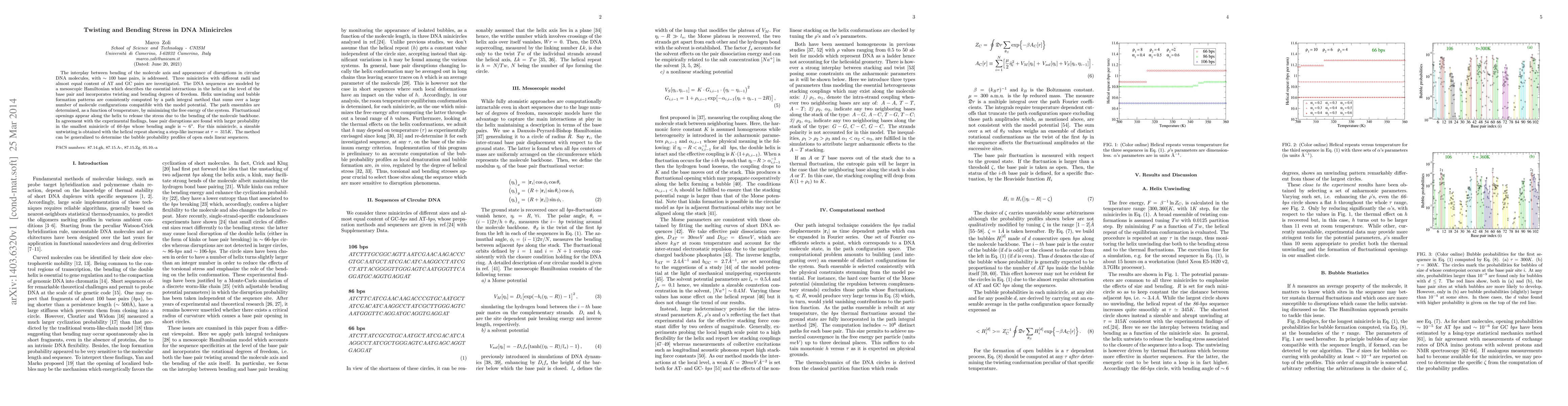 This study investigates the bending and twisting stress in DNA minicircles with approximately 100 base pairs, using a mesoscopic Hamiltonian to model the interactions and a path integral method to compute helix unwinding and bubble formation. The smallest minicircle (66-bps) exhibits significant untwisting and base pair disruptions due to higher bending stress, aligning with experimental observations.