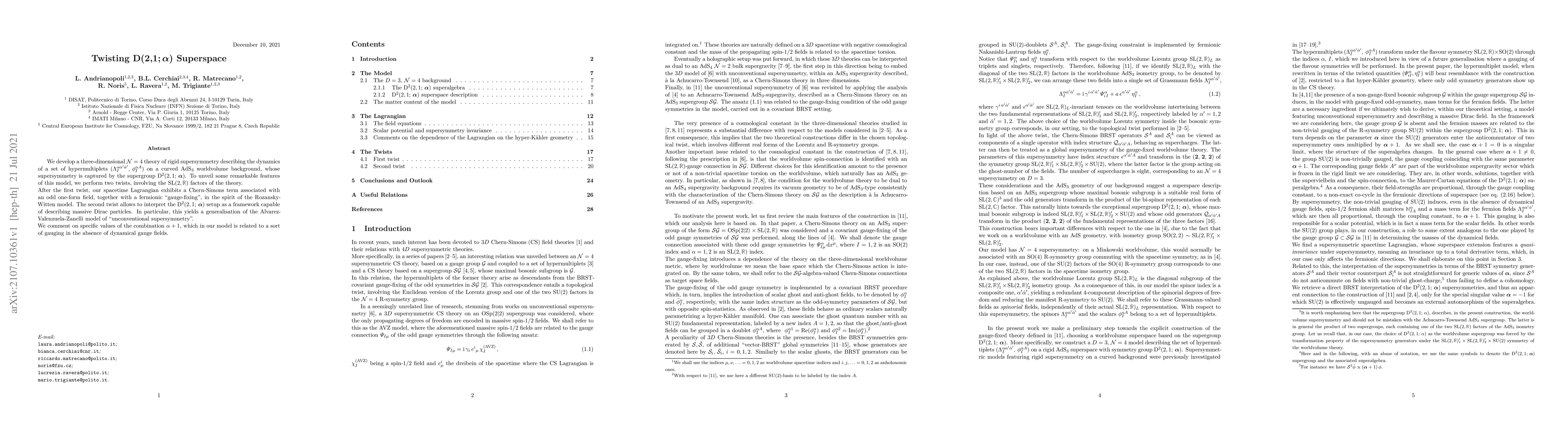 We develop a three-dimensional $\mathcal{N}=4$ theory of rigid supersymmetry describing the dynamics of a set of hypermultiplets $(\Lambda^{\alpha\alpha'\dot{\alpha}'}_I,\,\phi^{\alpha A}_I)$ on a curved AdS$_3$ worldvolume background, whose supersymmetry is captured by the supergroup ${\rm D}^2(2,1;\, \boldsymbol{\alpha})$. To unveil some remarkable features of this model, we perform two twists, involving the SL$(2,\mathbb R)$ factors of the theory. After the first twist, our spacetime Lagrangian exhibits a Chern-Simons term associated with an odd one-form field, together with a fermionic "gauge-fixing'', in the spirit of the Rozansky-Witten model. The second twist allows to interpret the ${\rm D}^2(2,1;\, \boldsymbol{\alpha})$ setup as a framework capable of describing massive Dirac particles. In particular, this yields a generalisation of the Alvarez-Valenzuela-Zanelli model of ''unconventional supersymmetry''. We comment on specific values of the combination $\alpha+1$, which in our model is related to a sort of gauging in the absence of dynamical gauge fields.