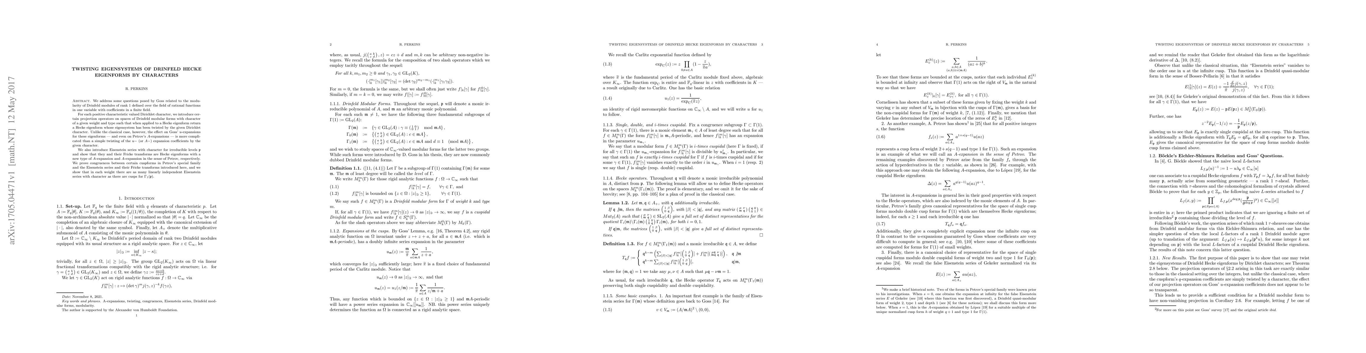 We address some questions posed by Goss related to the modularity of Drinfeld modules of rank 1 defined over the field of rational functions in one variable with coefficients in a finite field. For each positive characteristic valued Dirichlet character, we introduce certain projection operators on spaces of Drinfeld modular forms with character of a given weight and type such that when applied to a Hecke eigenform return a Hecke eigenform whose eigensystem has been twisted by the given Dirichlet character. Unlike the classical case, however, the effect on Goss' $u$-expansions for these eigenforms --- and even on Petrov's $A$-expansions --- is more complicated than a simple twisting of the $u-$ (or $A-$) expansion coefficients by the given character. We also introduce Eisenstein series with character for irreducible levels $\mathfrak{p}$ and show that they and their Fricke transforms are Hecke eigenforms with a new type of $A$-expansion and $A$-expansion in the sense of Petrov, respectively. We prove congruences between certain cuspforms in Petrov's special family and the Eisenstein series and their Fricke transforms introduced here, and we show that in each weight there are as many linearly independent Eisenstein series with character as there are cusps for $\Gamma_1(\mathfrak{p})$.