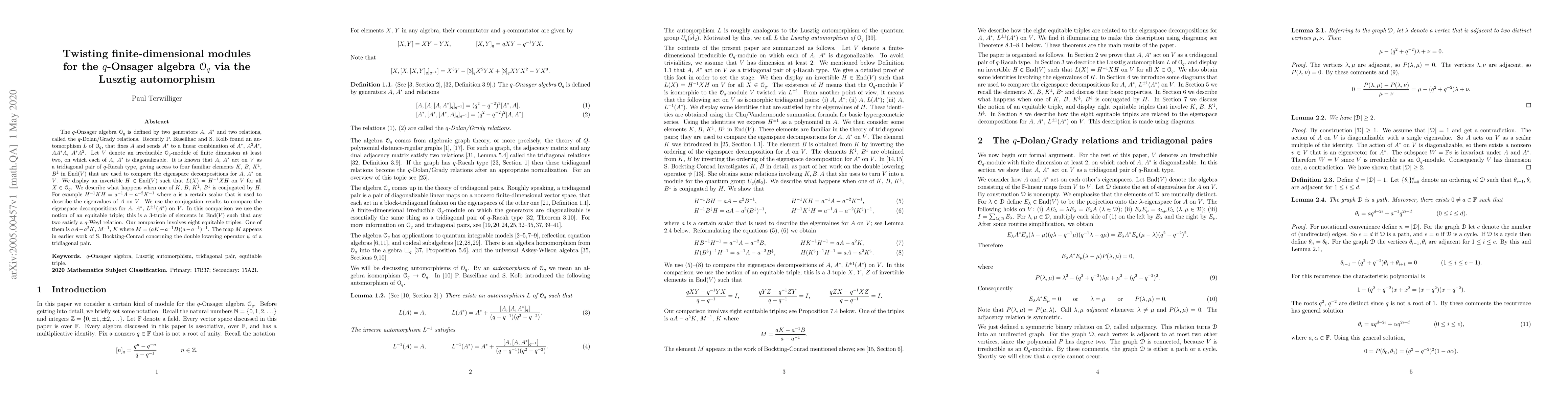 This paper explores the $q$-Onsager algebra $mathcal O_q$ and its automorphism $L$. It introduces an invertible endomorphism $H$ of a finite-dimensional irreducible module $V$, allowing for conjugation of algebra elements under $L$. The study uses equitable triples in ${ m End}(V)$ to compare eigenspace decompositions for various elements, including $A$, $A^*$, and $L^{pm 1}(A^*)$, thereby uncovering significant structural insights.