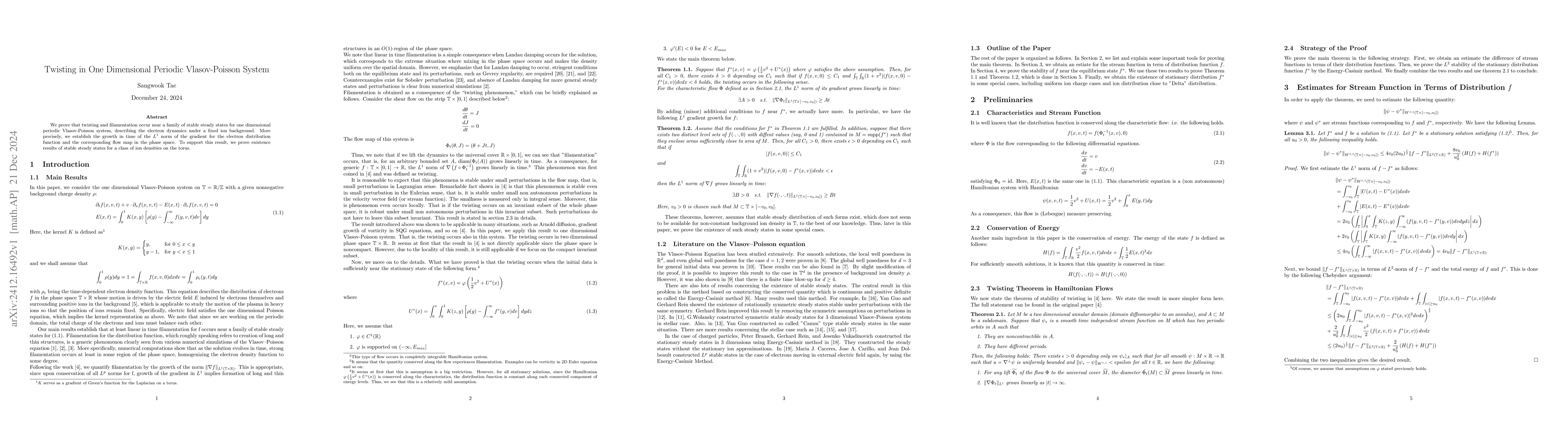 This paper demonstrates that twisting and filamentation phenomena arise near stable steady states in a one-dimensional periodic Vlasov-Poisson system, showing time growth in the L1 norm of the gradient for the electron distribution function and phase space flow map. It also establishes the existence of such stable steady states for certain ion densities on a torus.