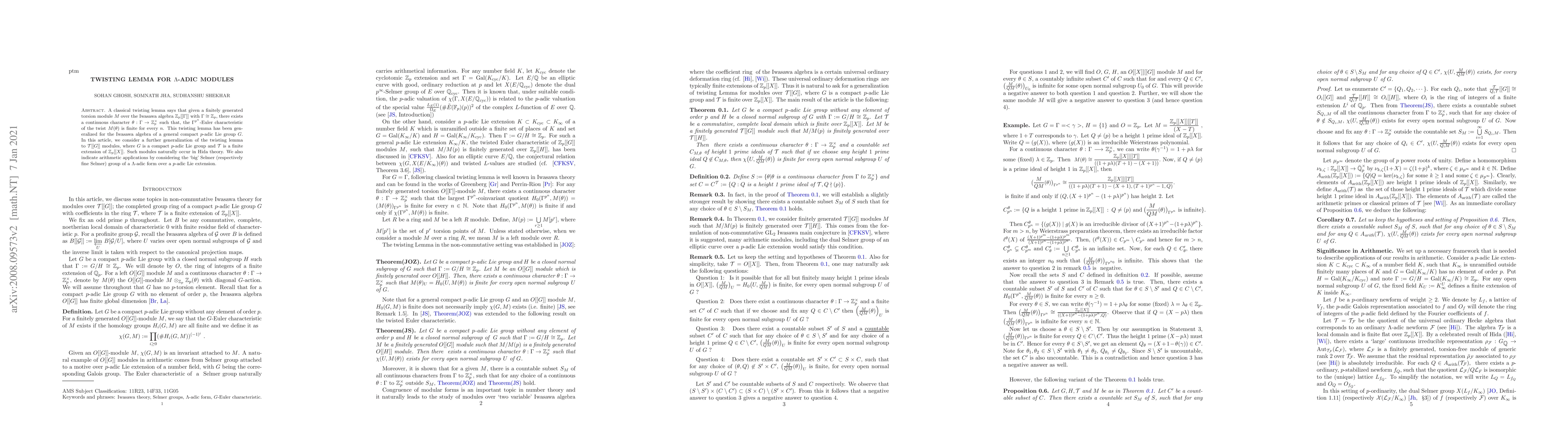 This paper generalizes the twisting lemma for $\Lambda$-adic modules over the Iwasawa algebra $\mathcal{T}[[G]]$ of a compact $p$-adic Lie group $G$, with $\mathcal{T}$ being a finite extension of $\mathbb{Z}_p[[X]]$. It also discusses arithmetic applications through the twisted Euler characteristic of big and fine Selmer groups for $\Lambda$-adic forms over $p$-adic Lie extensions.