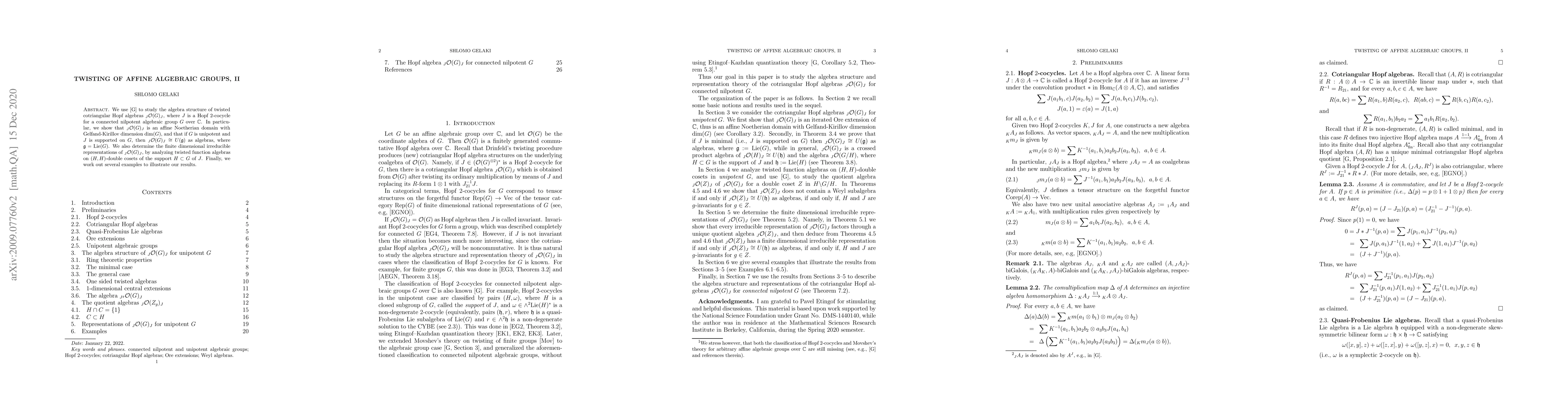 We use \cite{G} to study the algebra structure of twisted cotriangular Hopf algebras ${}_J\mathcal{O}(G)_{J}$, where $J$ is a Hopf $2$-cocycle for a connected nilpotent algebraic group $G$ over $\mathbb{C}$. In particular, we show that ${}_J\mathcal{O}(G)_{J}$ is an affine Noetherian domain with Gelfand-Kirillov dimension $\dim(G)$, and that if $G$ is unipotent and $J$ is supported on $G$, then ${}_J\mathcal{O}(G)_{J}\cong U(\g)$ as algebras, where $\g={\rm Lie}(G)$. We also determine the finite dimensional irreducible representations of ${}_J\mathcal{O}(G)_{J}$, by analyzing twisted function algebras on $(H,H)$-double cosets of the support $H\subset G$ of $J$. Finally, we work out several examples to illustrate our results.