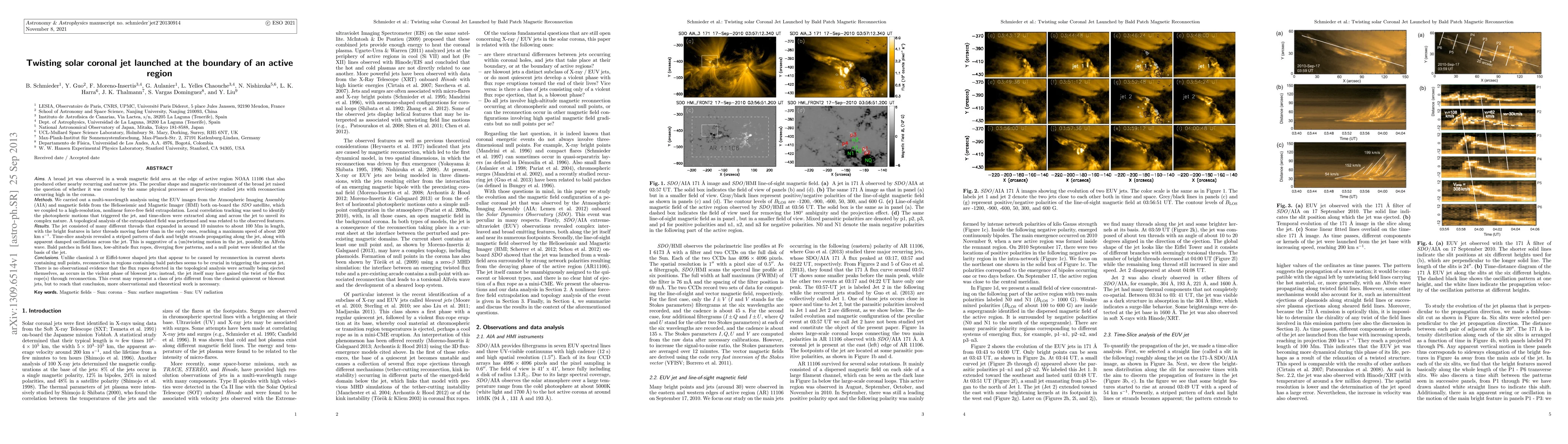 A broad jet was observed in a weak magnetic field area at the edge of active region NOAA 11106. The peculiar shape and magnetic environment of the broad jet raised the question of whether it was created by the same physical processes of previously studied jets with reconnection occurring high in the corona. We carried out a multi-wavelength analysis using the EUV images from the Atmospheric Imaging Assembly (AIA) and magnetic fields from the Helioseismic and Magnetic Imager (HMI) both on-board the SDO satellite. The jet consisted of many different threads that expanded in around 10 minutes to about 100 Mm in length, with the bright features in later threads moving faster than in the early ones, reaching a maximum speed of about 200 km s^{-1}. Time-slice analysis revealed a striped pattern of dark and bright strands propagating along the jet, along with apparent damped oscillations across the jet. This is suggestive of a (un)twisting motion in the jet, possibly an Alfven wave. A topological analysis of an extrapolated field was performed. Bald patches in field lines, low-altitude flux ropes, diverging flow patterns, and a null point were identified at the basis of the jet. Unlike classical lambda or Eiffel-tower shaped jets that appear to be caused by reconnection in current sheets containing null points, reconnection in regions containing bald patches seems to be crucial in triggering the present jet. There is no observational evidence that the flux ropes detected in the topological analysis were actually being ejected themselves, as occurs in the violent phase of blowout jets; instead, the jet itself may have gained the twist of the flux rope(s) through reconnection. This event may represent a class of jets different from the classical quiescent or blowout jets, but to reach that conclusion, more observational and theoretical work is necessary.