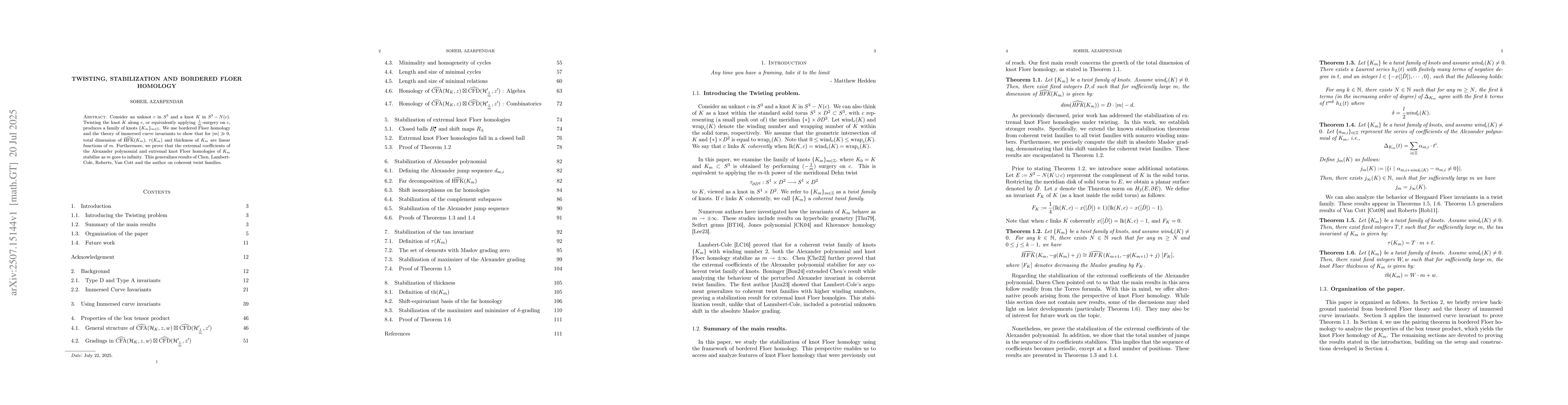 Consider an unknot $c$ in $S^3$ and a knot $K$ in ${S^3-N(c)}$. Twisting the knot $K$ along $c$, or equivalently applying $\frac{1}{m}$-surgery on $c$, produces a family of knots $\{K_m\}_{m \in \mathbb{Z}}$. We use bordered Floer homology and the theory of immersed curve invariants to show that for $|m|\gg0$, total dimension of $\widehat{\mathrm{HFK}}(K_m)$, $\tau(K_{m})$ and thickness of $K_{m}$ are linear functions of $m$. Furthermore, we prove that the extremal coefficients of the Alexander polynomial and extremal knot Floer homologies of $K_m$ stabilize as $m$ goes to infinity. This generalizes results of Chen, Lambert-Cole, Roberts, Van Cott and the author on coherent twist families.