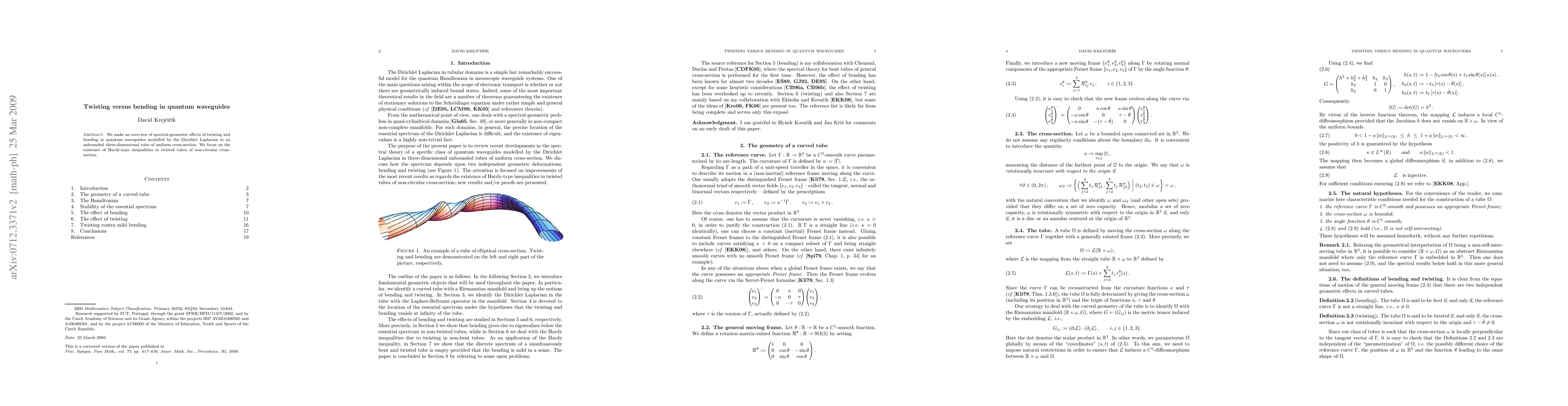 Summary: This paper reviews spectral-geometric effects of twisting and bending in quantum waveguides, specifically examining the Dirichlet Laplacian in twisted tubes with non-circular cross-sections. It investigates the existence of Hardy-type inequalities in these configurations.